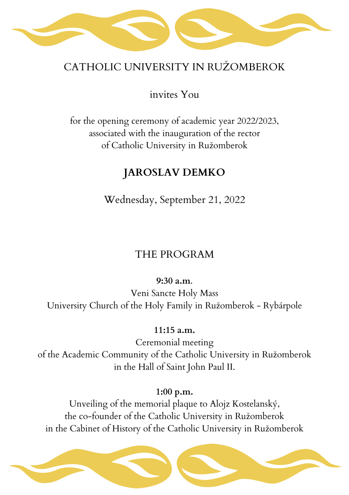 Catholic University in Ružomberok invites You for the opening ceremony of academic year 2022/2023, associated with the inauguration of the rector of Catholic University in Ružomberok Jaroslav Demko.