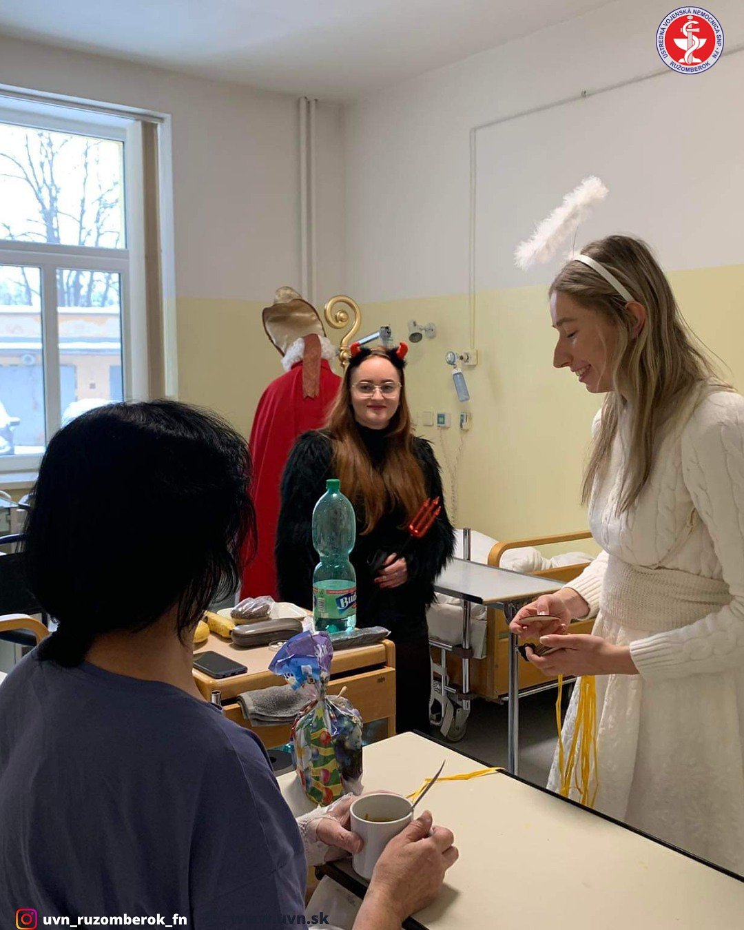 Not even this time Saint Nicholas with his loyal assistants - an angel, a devil and a photographer didn´t forget his traditional visit and visited patients at the Central Military Hospital – FN amt he Center for Social Services „Trojlístok“ in Ružomberok. A student from the A. Dubček University in Trenčín Bc. Pavol Mogora and the students of the 2nd year of bachelor study of nursing at our Catholic university, namely Andrea Dibdiaková, Natália Švajleninová, Natália Hollá, Lucia Pokrievková visited the children´s clinic, the oncology clinic and the long-term department ant also the clients of the Center for Social Services Trojlístok on December the 6th 2023. This event was enriched with the own program by clients of Trojlístok, namely they played piano, violin, they danced, recited poems and showed „devil´s program“. At least a little joy and smile in the suffering were brought by the students under the leadership of the head of Department of nursing at Faculty of Health, CU, Ružomberok, Marcela Ižová, PhD.. Many thanks to the charity of the sponsors – Bc. Pavlol Mogor, Marek Menich (Metro Žilina) and Roman Vereš from Rover company – they brought sweet suprises and St. Nichola´s medals. The words of the participants also speak about the course of the event:“It was a perfect event, full of open hearts, singing, smiling, humility, which was carried in the pre- Chtistamas spirit. The cliants of „Trojlístok“ left us with an unforgettable experience that brought a smile to their face and a tear to our eyes. In the hospital, both – the children and the adults dedicated a short poem or a song to the St. Nicholas. We believe thet this action will continue next year as well. “