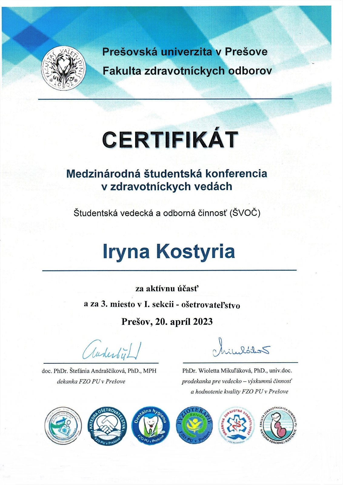 On April 20, 2023, the International Student Conference in Health Sciences, student scientific and professional activity (known as ŠVOČ) was held at the Prešov University in Prešov, Department of Health Sciences, through the Microsoft Teams Platform (online). Iryna Kostyria, a 3rd-year student from the Department of Nursing at the University in Ružomberok, took part in the activity with the topic "Quality of life of a patient with Parkinson's disease" and Lenka Ondrušková, a student at the Department of Physiotherapy, with the topic "The occurrence of pedes plani in preschool children and the possibility of its correction". Both students were successful, with Iryna Kostyria finishing in 3rd place and Lenka Ondrušková receiving an award. We heartily congratulate both our students."