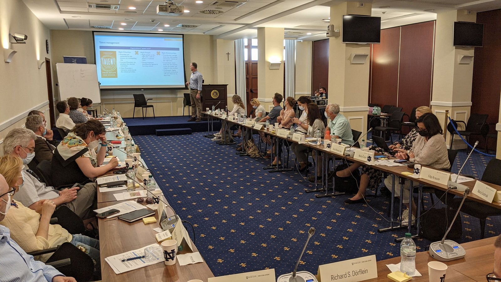 Participants from 6 CUP universities (Catholic University in Ružomberok, Catholic University of Croatia, John Paul II Catholic University of Lublin, Ukrainian Catholic University, Sulkhan-Saba Orbeliani University in Tbilisi and Pázmány Péter Catholic University) had a chance to discuss in detail their challenges in the context of the issue of resilience. The first day started with a presentation about the situation in Ukraine by our colleagues from Lviv and a retreat session led by Fr. Friedrich Bechina, undersecretary for the Congregation for Catholic Education. The program continued with presentations given by Clemens Sedmak and Monica Caro (the Nanovic Institute), Carolyn Woo (retired president of Catholic Relief Services and previous dean of the Mendoza College of Business, University of Notre Dame), David Buckley (managing director of General Atlantic), Helen Alford and Piotr Janas (Pontifical University of St. Thomas Aquinas in Rome).