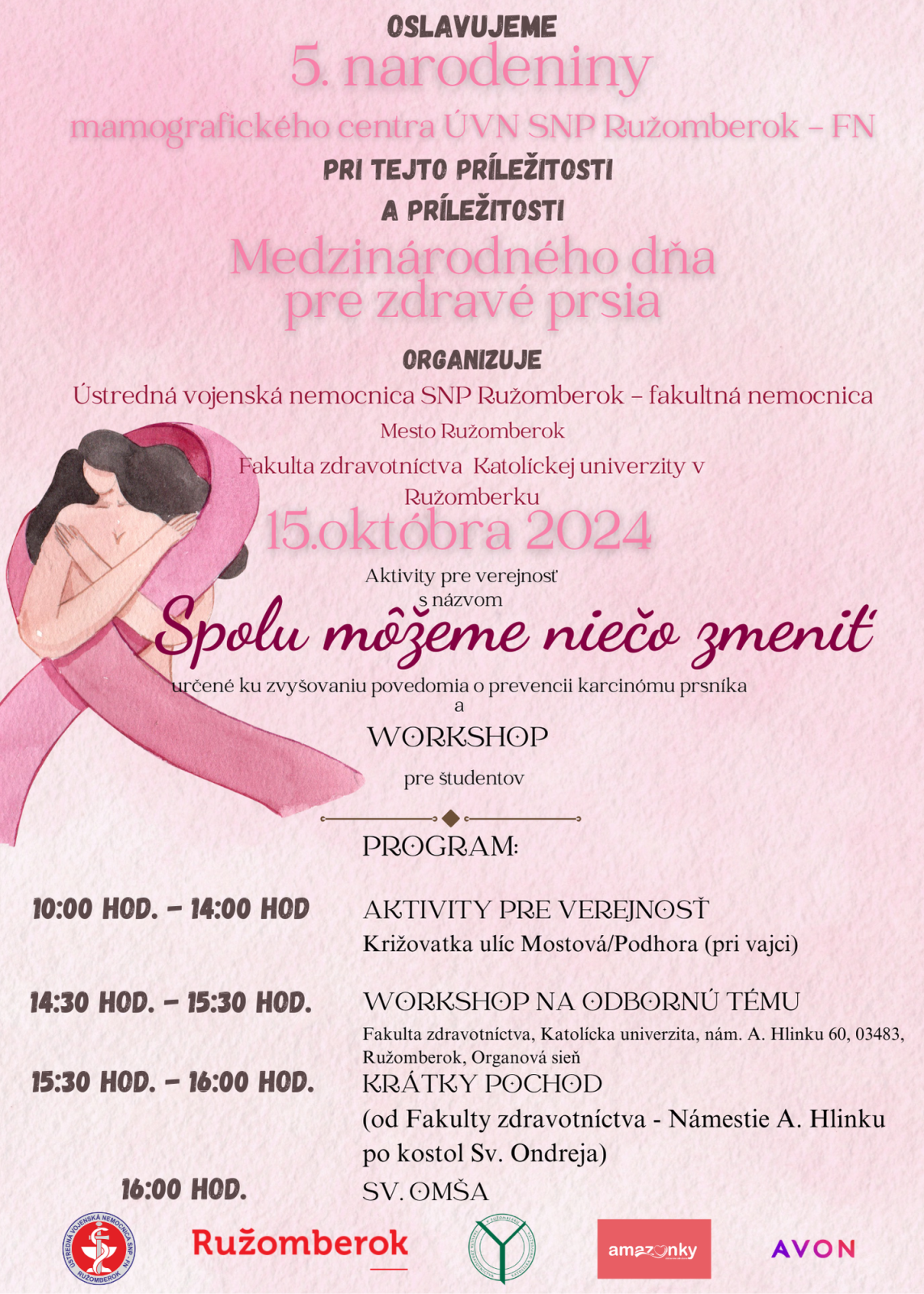 Pri príležitosti 5. výročia mamografického centra ÚVN SNP Ružomberok – FN, vás srdečne pozývame na podujatie „Spolu môžeme niečo zmeniť“, ktoré sa uskutoční 15. októbra 2024