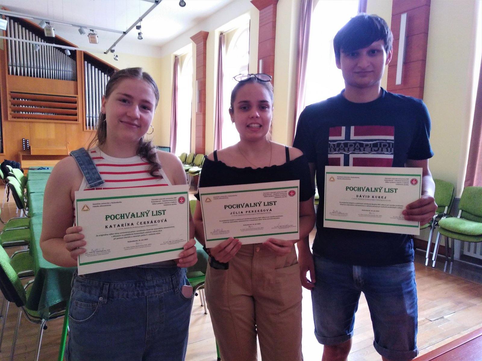 V letnom semestri akademického roka 2022/2023 sa na FZ KU v Ružomberku začala výučba výberového predmetu Úvod do vojenského zdravotníctva. Historicky prvými absolventmi predmetu sa stali študenti 2. ročníkov študijných programov ošetrovateľstvo, rádiologická technika, verejné zdravotníctvo a urgentná zdravotná starostlivosť. V piatok 16. júna sa v Organovej sieni na FZ KU za účastí pozvaných hostí uskutočnilo záverečnéstretnutie vyučujúcej PhDr. Andrei Ševčovičovej, PhD., MPH. so študentami, v rámci ktorého boli Pochvalným listom ocenení viacerí poslucháči. Za aktívny prístup k výučbe, realizáciu praktických cvičení, výber a spracovanie témy seminárnej práce sa medzi ocenenými zaskveli Veronika Hollá (ošetrovateľstvo), Aneta Šostroneková (ošetrovateľstvo) a Denys Dishur (urgentná zdravotná starostlivosť). Oceneným blahoželali zástupca riaditeľa UVN SNP Ružomberok – FN MUDr. Vladimír Lengvarský, MPH., hlavná sestra úseku zdravotnej a ošetrovateľskej starostlivosti UVN štábna nadrotmajsterka Mgr. Silvia Simová, MPH. a prodekan pre vedu, výskum a zahraničné vzťahy FZ KU v Ružomberku doc. PhDr. Bc. Jozef Babečka, PhD. V záverečnej diskusii s hosťami študenti vyjadrili spokojnosť s výučbou a predostreli svoje plány na ďalšie pôsobenie v zdravotníckej profesii. Autori s najlepšie spracovanými seminárnymi prácami boli vyučujúcou oslovení k ich publikácii v odborných časopisoch.