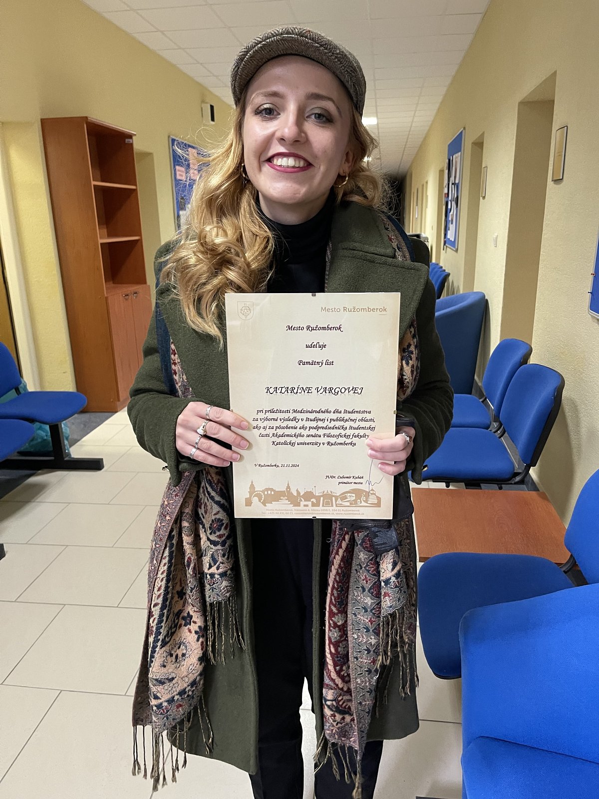Mgr. Katarína Vargová je študentkou, na ktorú sa vedenie Filozofickej fakulty KU môže kedykoľvek s prosbou obrátiť a ktorá výrazne prispieva k šíreniu dobrého mena Katolíckej univerzity v Ružomberku.