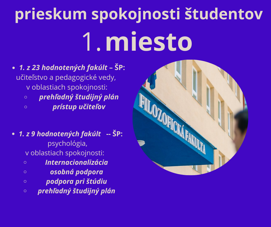 Filozofická fakulta KU skončila prvá v oblasti spokojnosti "prístup učiteľov" v študijnom odbore "učiteľstvo a pedagogické vedy" (z 23 hodnotených fakúlt).