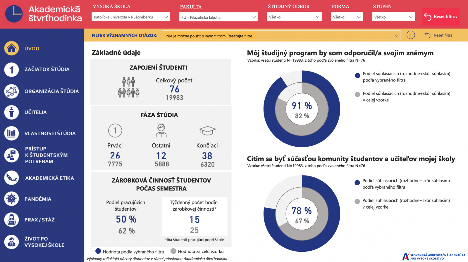 Našim študentom a absolventom ďakujeme za spätnú väzbu. Teší nás, že v mnohých ukazovateľoch sú prevažne spokojní a veríme, že spoločne budeme pracovať na skvalitnení vzdelávania a celkovo študentského života na našej fakulte a univerzite.