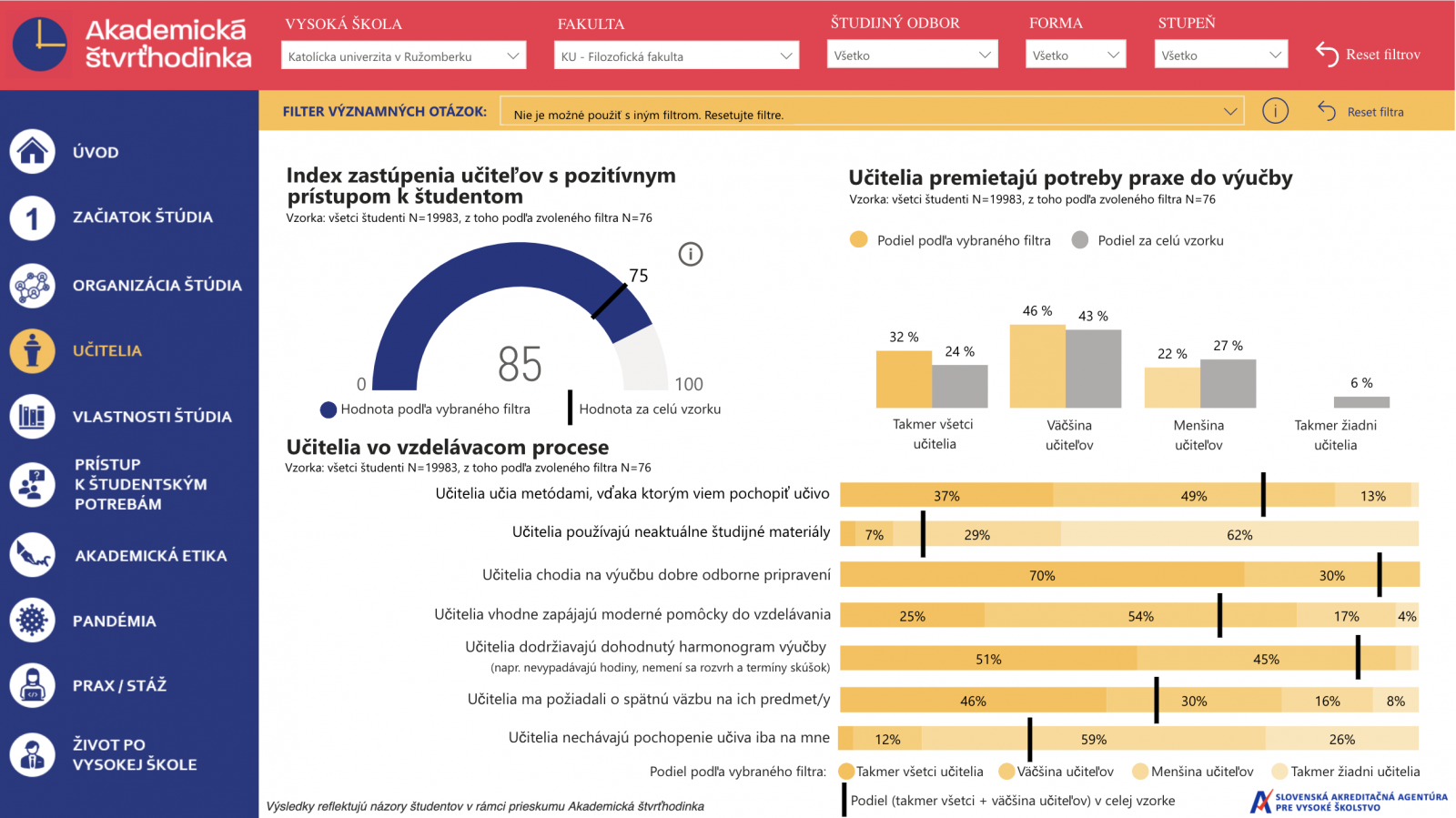 - index zastúpenia učiteľov s pozitívny prístupom k študentom ja na našej fakulte 85 (slovenský priemer je iba 75),