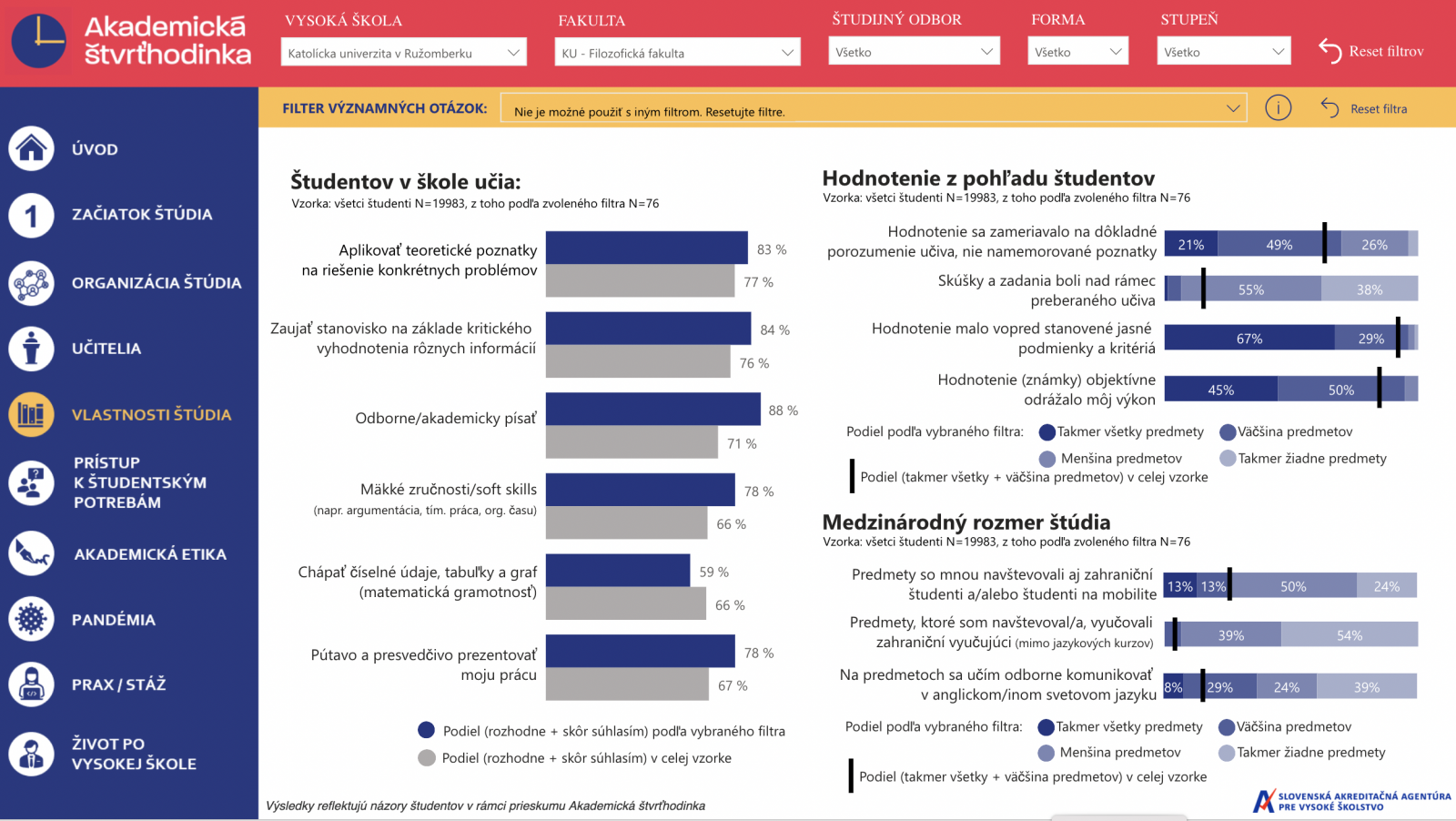 - naši študenti tiež oceňujú to, že ich v škole učíme aplikovať teoretické poznatky na riešenie konkrétnych problémov (FF KU 83 %, slovenský priemer 77 %), zaujať stanovisko na základe kritického vyhodnotenia rôznych informácií (FF KU 84 %, slovenský priemer 76 %), odborne písať (FF KU 88 %, slovenský priemer 71 %) či mäkké zručnosti (FF KU 78 %, slovenský priemer 66 %).
