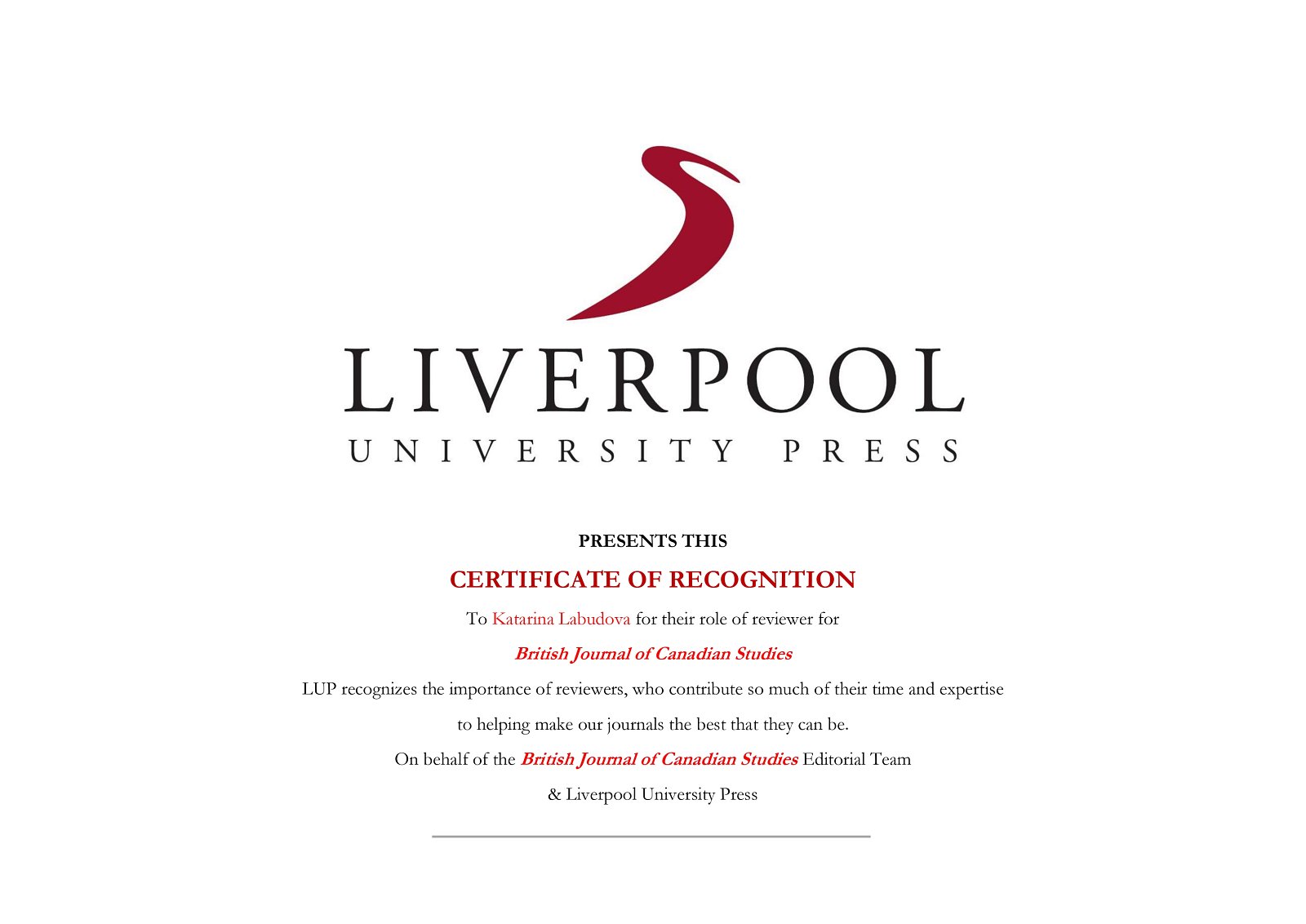 Katarína Labudová získala ocenenie Liverpool University Press Reviewer Rewards 2023, a to za jej dlhoročnú a kvalitnú recenzentskú činnosť vo vedeckom časopise British Journal of Canadian Studies.