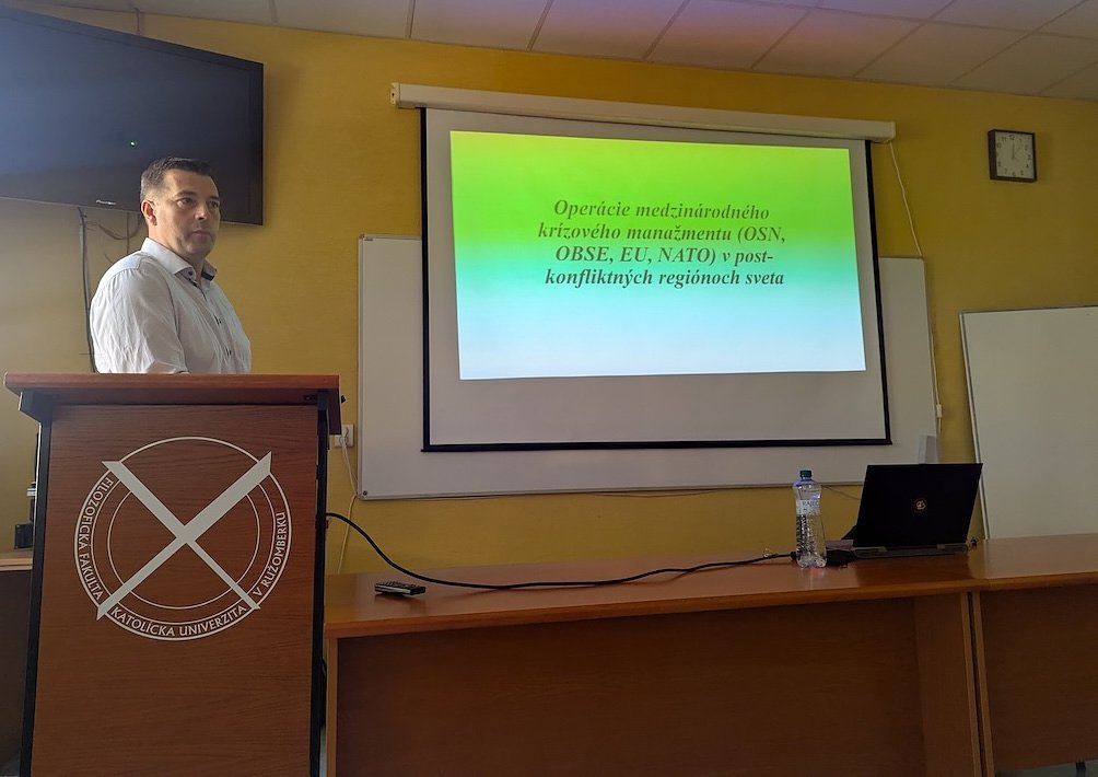 Posledný aprílový deň sa na Filozofickej fakulte KU uskutočnila druhá hosťovská prednáška v rámci Jean Monnet projektu European Perspectives on Climate, Conflict, and Migration (EUPECCOM). O skúsenostiach z oblasti medzinárodného krízového manažmentu (oblasť peacekeeping) pod záštitou takých organizácií ako OSN, OBSE a pod. sa so študentmi prišiel podeliť bývalý policajt a právnik Tomáš Klopta. Na úvod prednášky predstavil základné ciele takýchto misií a stručne predstavil históriu a oblasti, v ktorých misie boli realizované a dodnes prebiehajú. V druhej časti sa Tomáš Klopta venoval vlastným skúsenostiam, keďže sa sám zúčastnil viacerých misií, či už v nadväznosti na vojnu v Iraku, v bývalej Juhoslávii a nakoniec aj v konfliktnej zóne Donbasu na hraniciach medzi Ukrajinou a Rusmi podporovanými separatistickými oblasťami ešte pred samotnou inváziou Ruska na Ukrajinu.