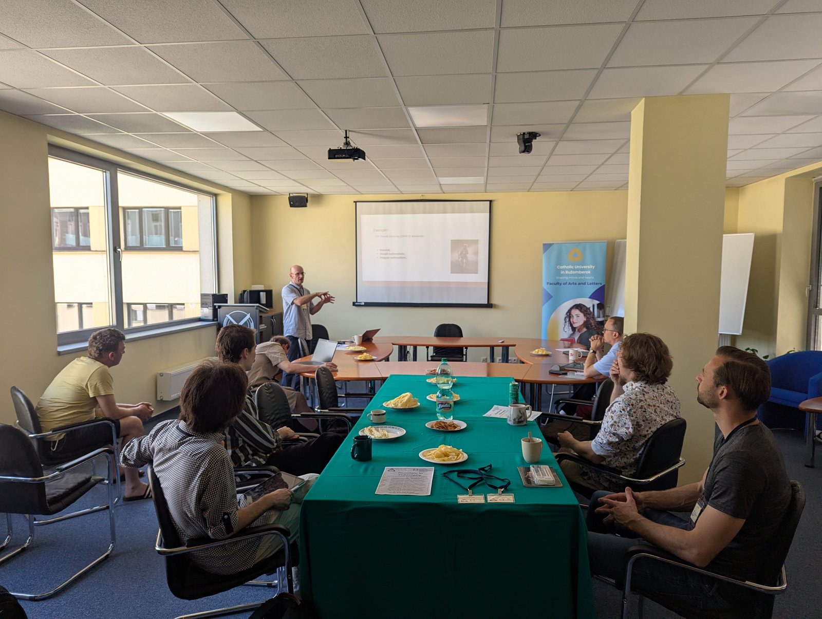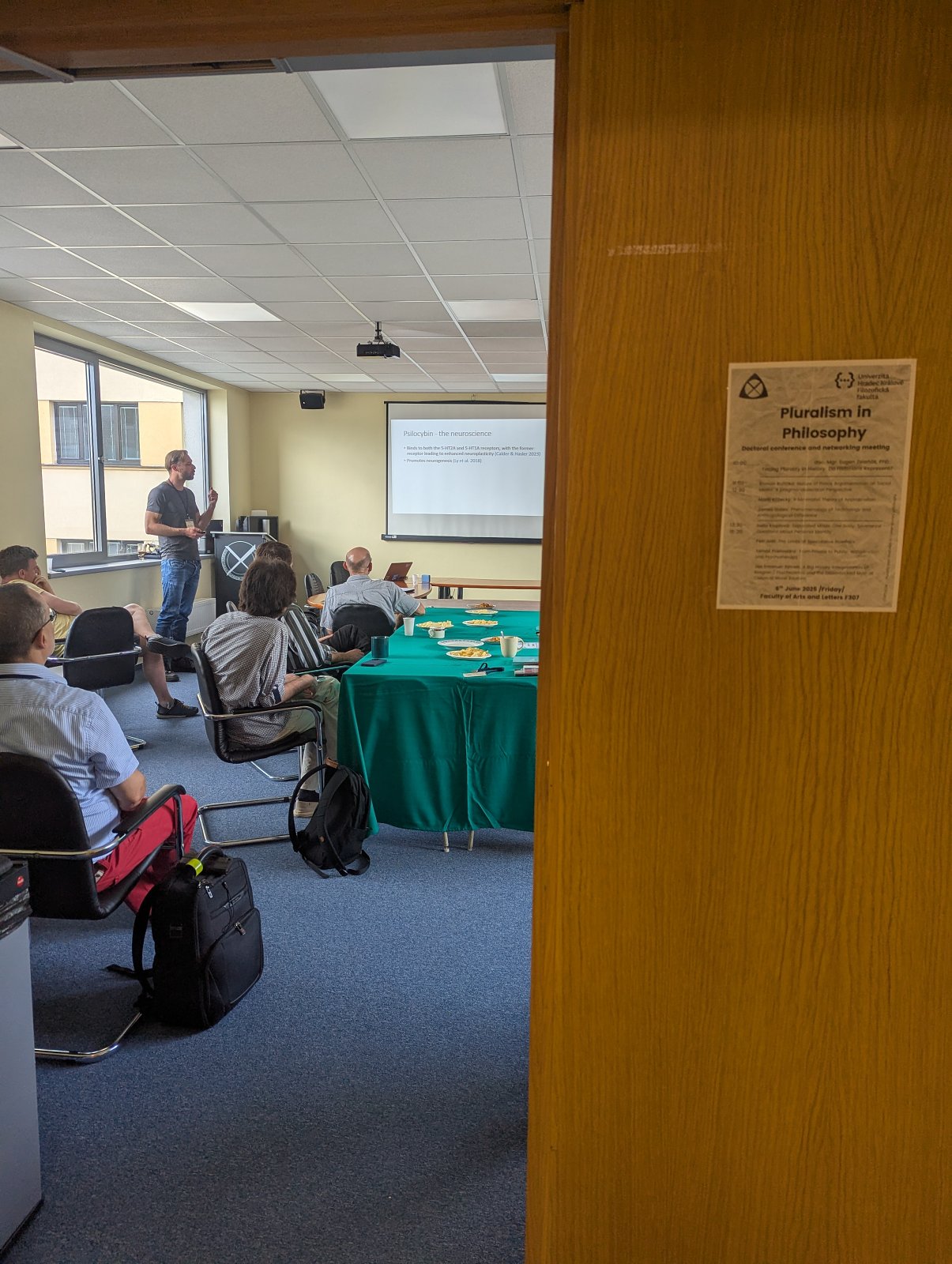 Na konci prvého júnového týždňa nás navštívili kolegovia z Katedry filozofie a spoločenských vied z Univerzity Hradec Králové. Konkrétne išlo o 3 doktorandov a 1 študenta magisterského stupňa z oblasti filozofie v sprievode vedúceho katedry Michala Rigela. Zúčastnili sa na doktorandskej konferencii Pluralism in Philosophy, v rámci ktorej každý z nich prezentoval výsledky svojho výskumu. Konkrétne išlo o nasledovných študentov: Matěj Křížecký, James Gates (študent magisterského stupňa), Petr Jošt a Jas Emanuel Symen. Z domácich doktorandov na konferencii prezentovali Iveta Kloptová a Tomáš Priehradný. Okrem študentov s prednáškou vystúpil i vyučujúci domácej katedry filozofie Eugen Zeleňák. Prezentujúci sa venovali rôznorodým filozofickým témam a problémom; diskutovali napr. o špekulatívnej bioetike, osobnej identite, špecifickom výklade pôvodu náboženstva, ale tiež o Wittgensteinovi a psychoterapii či o rôznych teóriách vlastníctva.