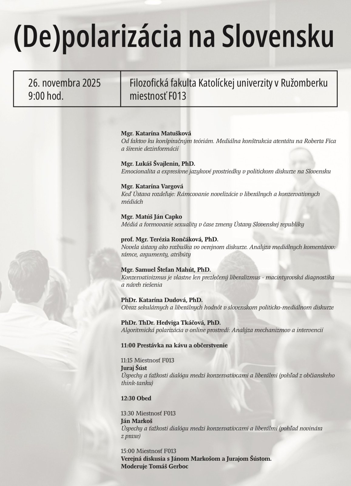 Na konferencii sa stretnú akademici, odborníci z praxe aj zástupcovia občianskej spoločnosti, aby spoločne skúmali príčiny, dôsledky a riešenia súčasného názorového a hodnotového rozdelenia.