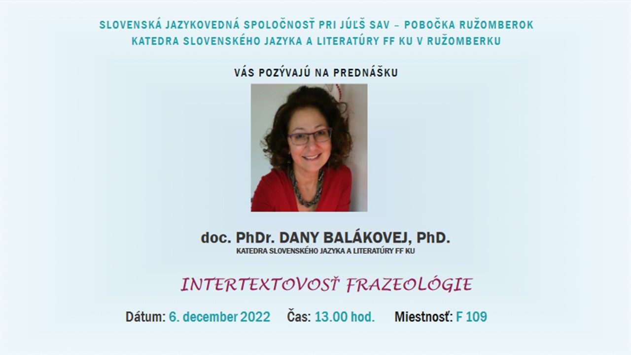 Slovenská jazykovedná spoločnosť pri JÚĽŠ SAV a Katedra slovenského jazyka a literatúry FF KU v Ružomberku Vás pozývajú na prednášku Intertextovosť frazeológie