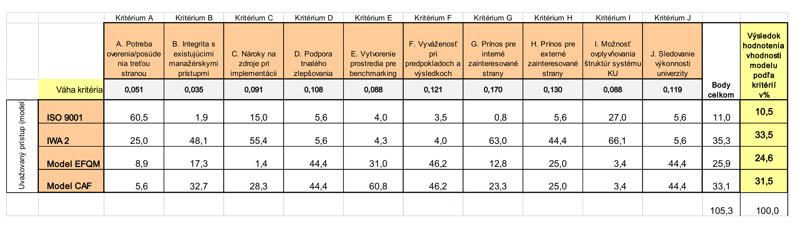 Práve odporúčania členov medzinárodnej akreditácie a úspešné zvládnutie prvej komplexnej akreditácie na Slovensku nás viedlo identifikovaniu, ktorý zo systémov manažérstva kvality vhodných pre vysoké školy by sme mohli implementovať. Práve výber vhodného systému z možných ISO 9001, IWA 2, Model výnimočnosti EFQM, CAF a Education a ESG bola nákladná a náročná záležitosť. Celý tento proces je podrobne popísaný v publikácií Hrnčiar, Tkačik: Dobrá prax tvorby vnútorného modelu kvality na univerzite. Vykonala sa analýza s využitím matice prioritizácie (Prioritization Matrix), ktorá je použiteľná v prípade, ak je potrebné jednoznačne odlíšiť vhodnosť navrhovaných modelov a ak nie je možné získať konkrétne merateľné hodnoty na určenie výhodnosti sledovaného modelu, teda predpokladaných dopadov. Metóda je založená na vzájomnom porovnávaní určených variantov podľa jednotlivých kritérií, pričom sa rozlišuje veľkosť rozdielu, resp. výhodnosti využitia jedného modelu voči druhému. Porovnávanie bolo vykonané úzkou skupinou expertov z vnútorného (špecialisti na súčasný stav) i z vonkajšieho (špecialisti na modeli) prostredia vzdelávacej inštitúcie. Z analýzy vyplynulo, že najvhodnejším systémom na implementáciu je systém IWA 2 (obrázok 2)