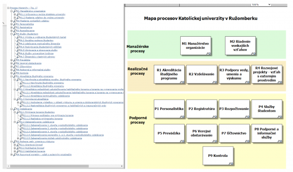 Práve pre úspešnú implementáciu uvedeného systému bolo potrebné navrhnúť a overiť priamy systém merania kvality študijných programov, charakterizovať kvalitné výstupy výskumu na KU v jednotlivých oblastiach výskumu. To sa podarilo vďaka implementácií a riešeniu druhého projektu kvality na KU Zvýšenie kvality vzdelávania, výskumu a systému riadenia na Katolíckej univerzite v Ružomberku. V rámci neho boli vytvorené procesné mapy pre jednotlivé činnosti, ktoré sa na univerzite/fakulte uskutočňovali (obrázok 3).