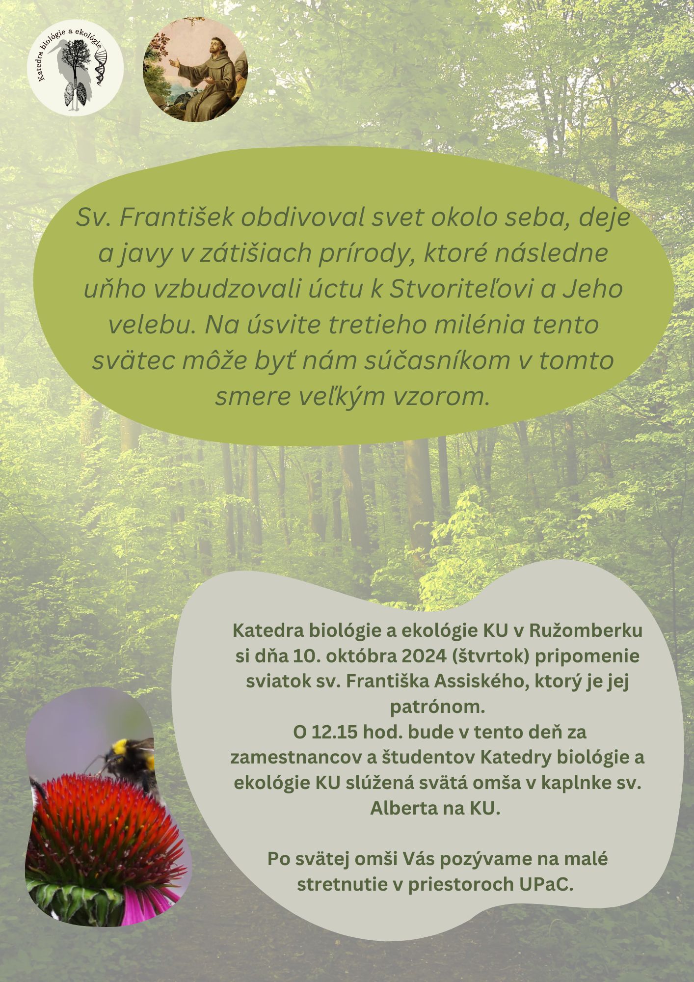 Katedra biológie a ekológie KU v Ružomberku si dňa 10. októbra 2024 (štvrtok) pripomenie sviatok sv. Františka Assiského, ktorý je jej patrónom.
