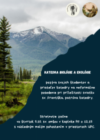 Dňa 5.októbra 2023 sa celá Katedra biológie a ekológie stretla spoločne osláviť patróna Katedry biológie – sv. Františka. Slávnosť začala svätou omšou, kde sme si pripomenuli svätca a jeho postoj ku všetkému živému stvoreniu. Pokračovali sme v priestoroch Univerzitného Pastoračného Centra pri kávičke a občerstvení neformálnym stretnutím. Bola to vhodná príležitosť privítať medzi nami nových prvákov a začleniť ich aj do spoločenského života Katedry. Kolegovia z Katedry a starší študenti si pripravili prezentácie – udalostí ktoré sme absolvovali od posledného stretnutia. Cvičenia, ktoré sú náplňou študijného plánu, ale i aktivity, ktoré Katedra pripravuje pre iné vzdelávacie inštitúcie i verejnosť. Súčasťou boli aj informácie z absolvovaných pobytov v rámci ERAZMU, či projektové aktivity Katedry.