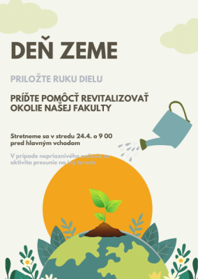 Aj tento rok naša katedra organizuje pri príležitosti Dňa Zeme pracovné stretnutie zamerané na revitalizáciu okolia našej fakulty. Tento rok sa okrem čistenia okolia budov zameriame aj na skrášľovanie a tvorenie. Postaráme sa o kvetinovú výzdobu budovy, rozšírime živé ploty, vytvoríme záhony pred budovou a bylinkové záhony vo dvore. Tešíme sa na vašu účasť, veríme, že sa stretneme vo veľkom počte.