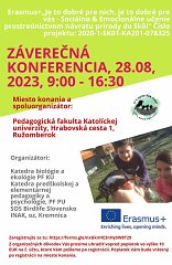 V spolupráci s ornitologickou spoločnosťou SOS/Birdlife Slovensko sa zúčastnila RNDr. Mária Balážová, PhD. tréningových programov pre učiteľov zameraných na sociálno–emočné vzdelávanie v rámci Erasmus+ projektu „It´s good for them, it´s good for you – Social &Emotional Learning through bringing nature back to schools“ – SEL for Schools. V kontexte výsledkov záverečného programu, ktorý sa konal v júli v španielskom meste Girona, sme na našej katedre privítali aj učiteľov zo Slovenska na Záverečnej konferencii k projektu. V spolupráci s riešiteľmi projektu, OZ INAK, Katedrou predškolskej a elementárnej pedagogiky a psychológie PF PU a spomínanej organizácie SOS/Birdlife Slovensko, sme učiteľov nielen oboznámili s princípmi sociálno-emočného vzdelávania v spojení s prírodou, ale vyskúšali si aj konkrétne podporné aktivity v Hrabovskej doline.
