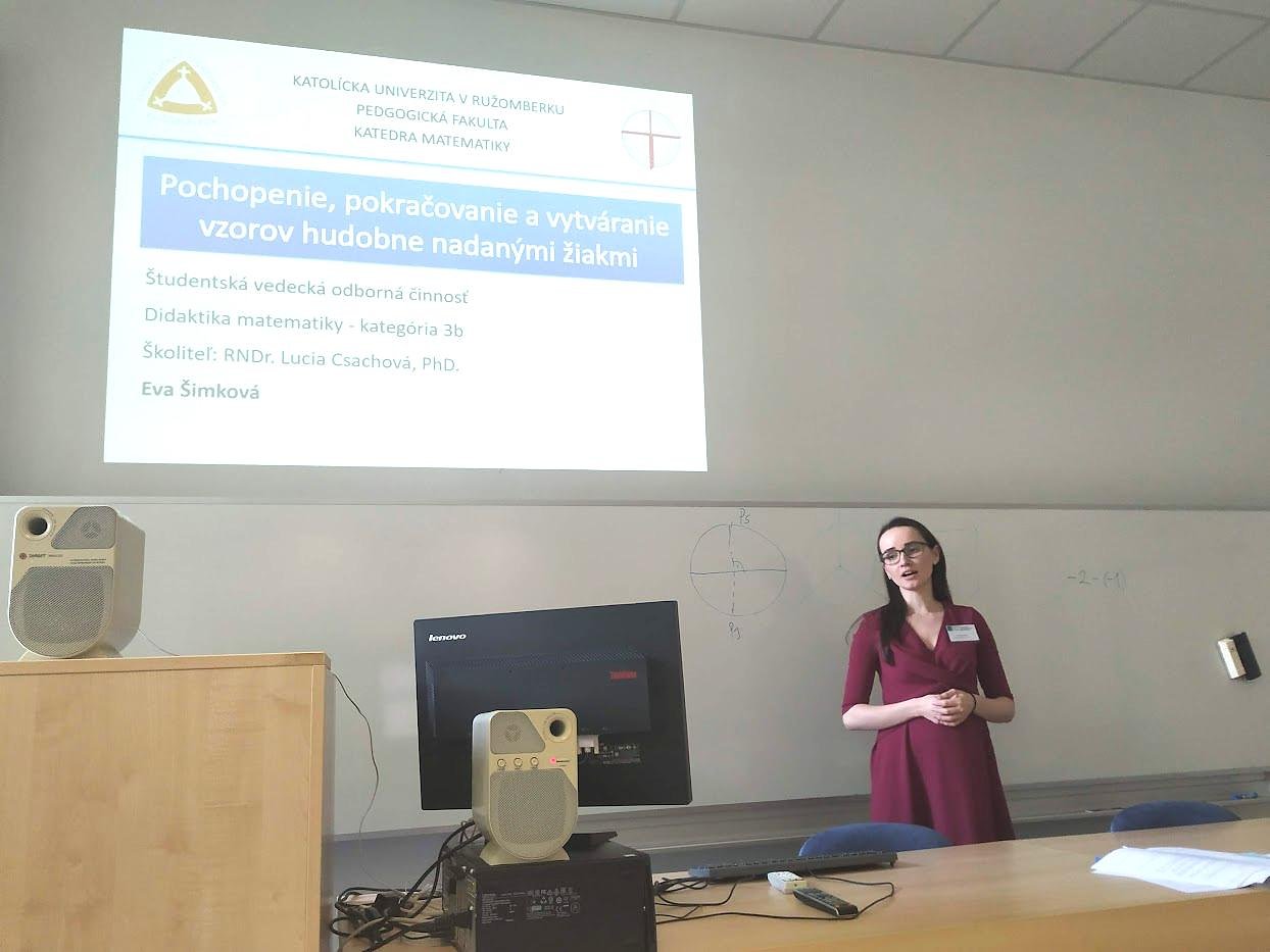 Katedru matematiky zastupovala Mgr. Eva Šimková so svojou diplomovou prácou Pochopenie, pokračovanie a vytváranie vzorov hudobne nadanými žiakmi, s ktorou získala 3. miesto (z 9 zúčastnených diplomových prác z didaktiky matematiky pre 2. a 3. stupeň).