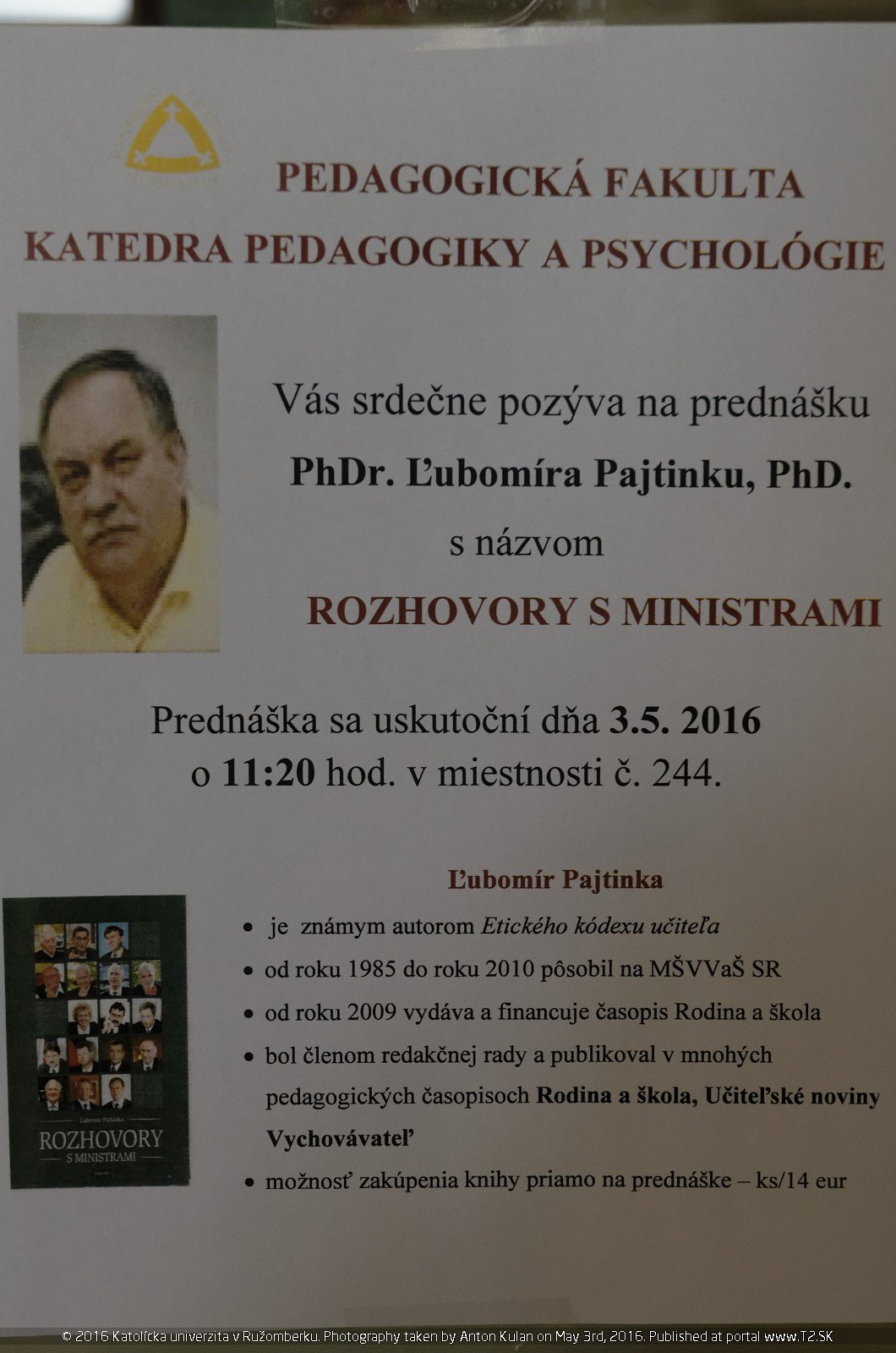 3.5. 2016 zavítal na pôdu PF KU Dr. Pajtinka, ktorý predstavil svoju zaujímavú publikáciu Rozhovory s ministrami. Beseda sa tešila veľkému záujmu poslucháčov.