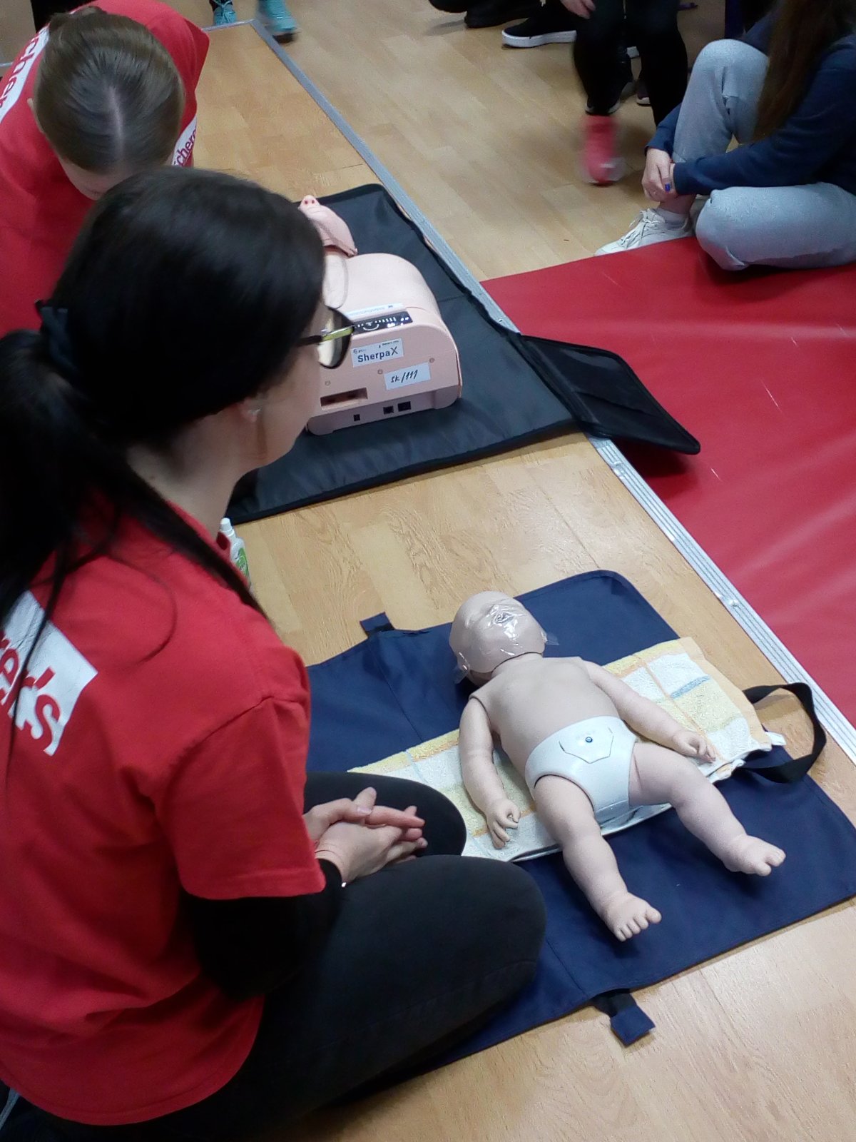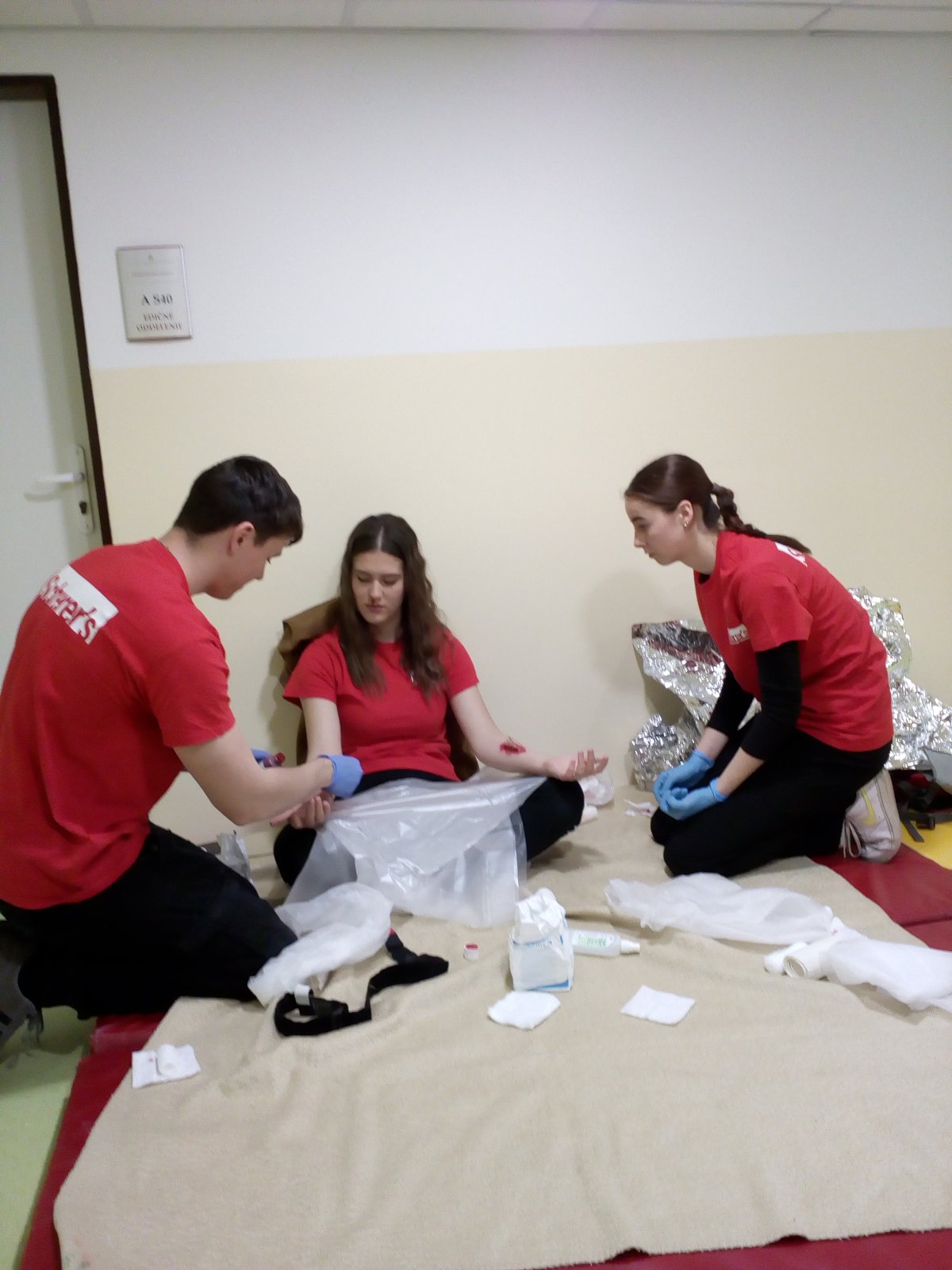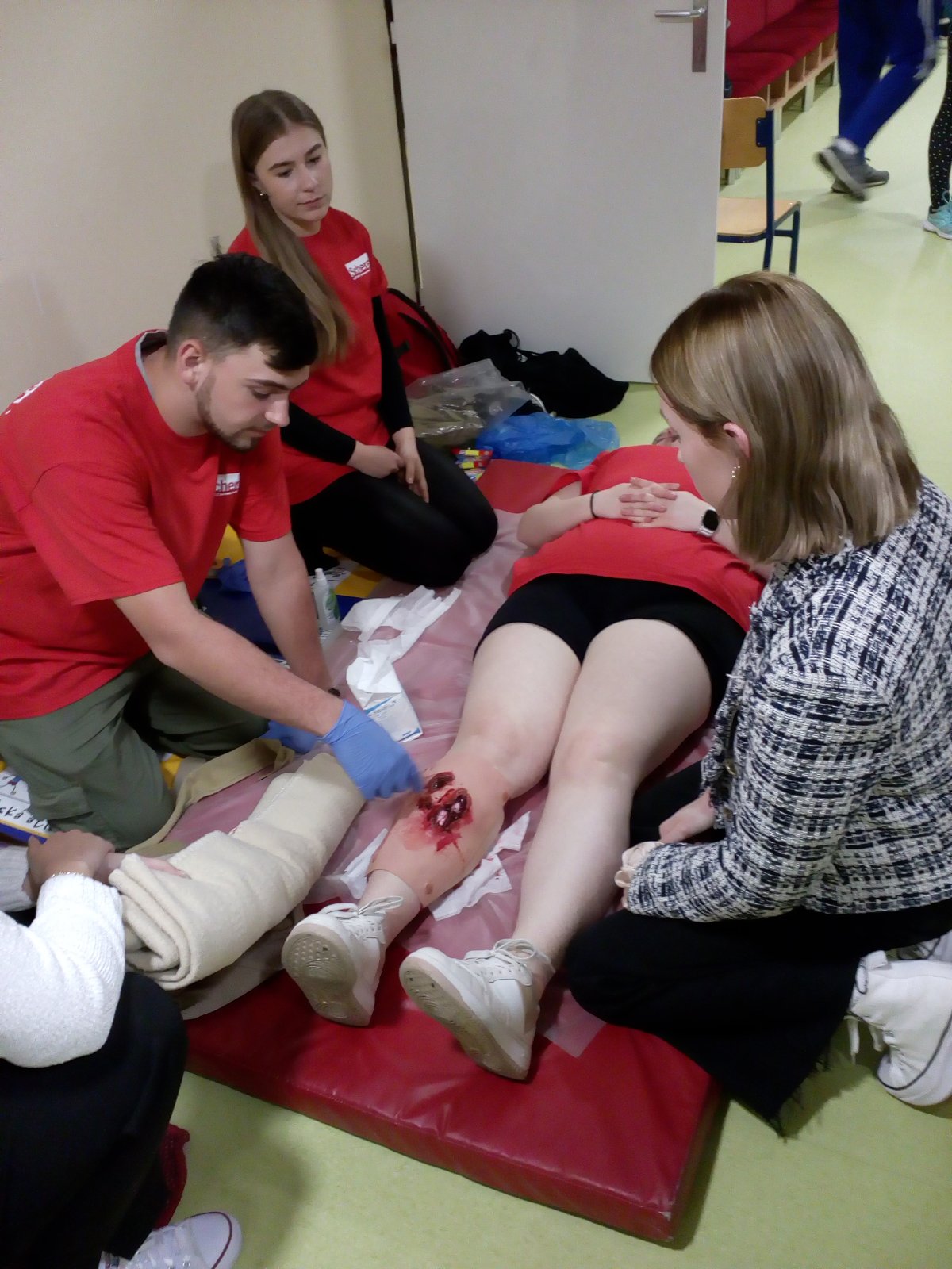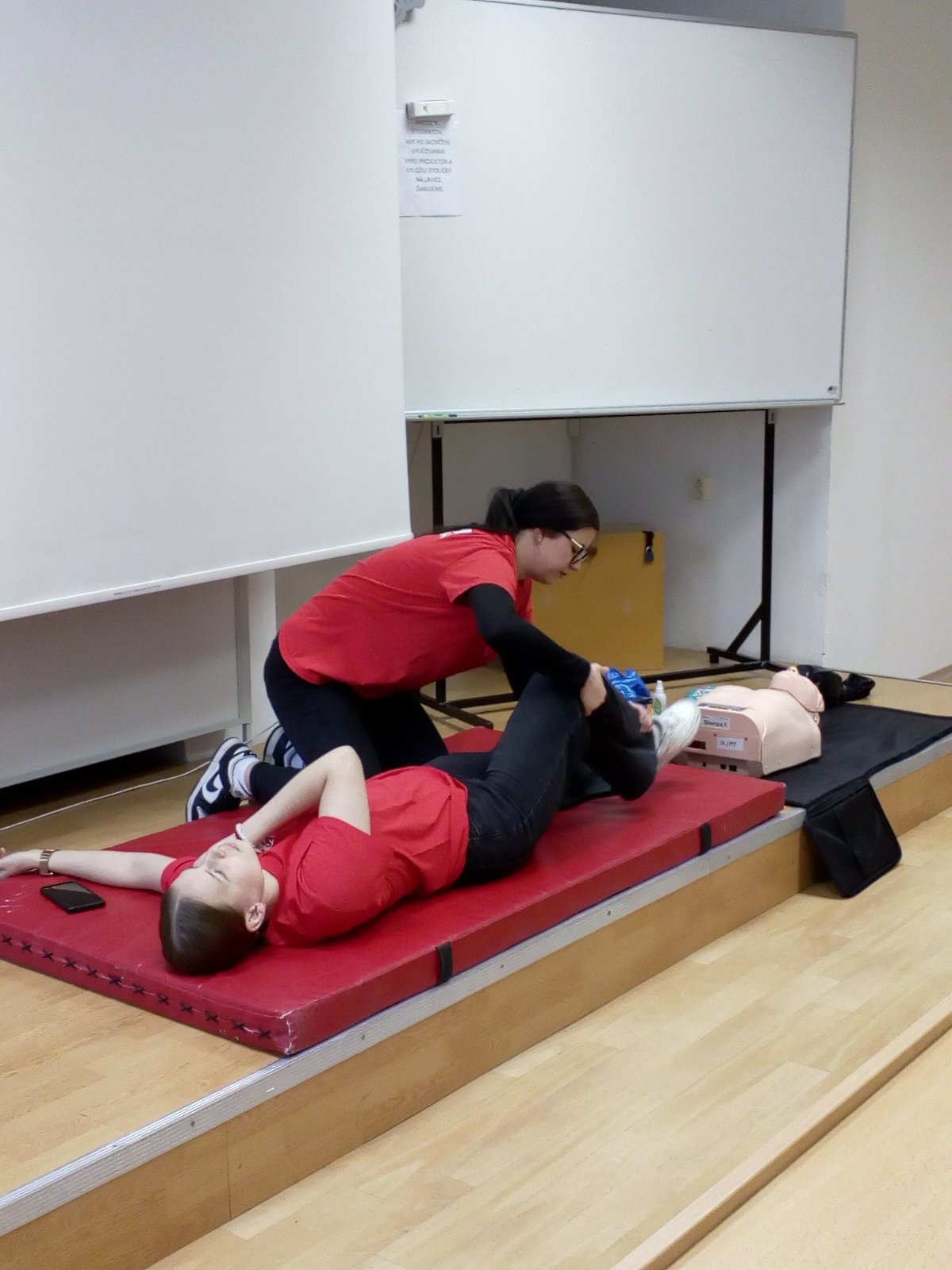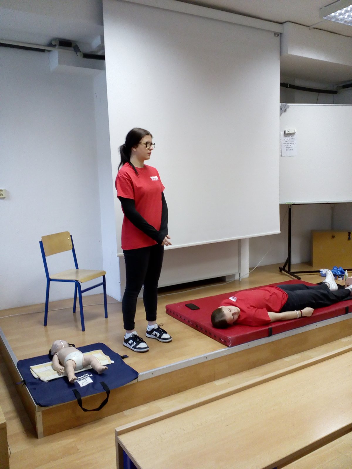 Pri príležitosti Dňa zdravia, ktorý si pripomíname v mesiaci apríl, sa 16. 4. 2024 na KPEP konalo stretnutie s odborným tímom pedagógov a študentov Strednej zdravotníckej školy Márie Terézie Schererovej. Cieľom podujatia bolo poskytnúť študentom prvých ročníkov predprimárneho vzdelávania a učiteľstva pre primárne vzdelávanie teoretickú a praktickú ukážku prvej pomoci a následne si ju vyskúšať na simulovaných situáciách a namaskovaných zraneniach. Pripravených bolo päť stanovíšť, kde bolo možné vyskúšať si základnú kardiopulmonálnu resuscitáciu (KPR) – masáž srdca a umelé dýchanie na resuscitačnej figuríne dospelej osoby i dojčaťa, Heimlichov manéver pri dusení, prvú pomoc pri nevoľnosti a anafylaktickom šoku, znehybnenie končatín pri zlomeninách, ošetrenie rany s vonkajšou zlomeninou, ošetrenie rany pri bežnom poranení a rany so zapichnutým sklom, taktiež aj zastavenie krvácania z nosa. Študentky boli vďačné za toto podujatie, ktoré im bude nápomocné v ich pedagogickej praxi. Ocenili profesionálnu a odbornú pripravenosť celého tímu svojím záverečným búrlivým potleskom.