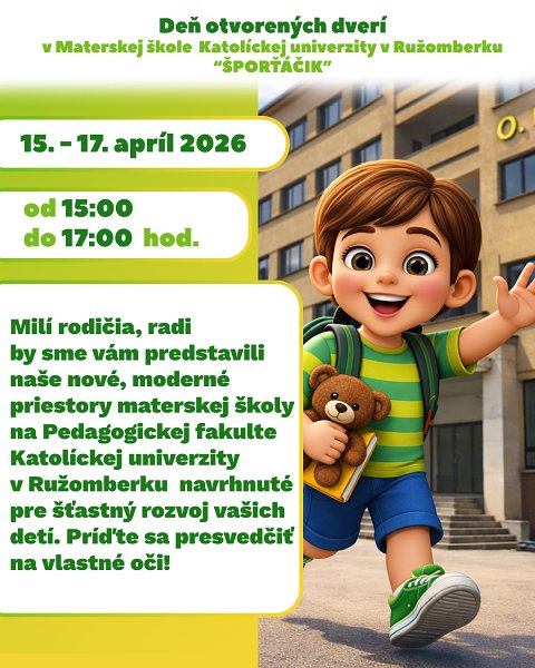 Milí rodičia, srdečne Vás pozývame na Deň otvorených dverí v Materskej škole Katolíckej univerzity v Ružomberku "ŠPORŤÁČIK"
