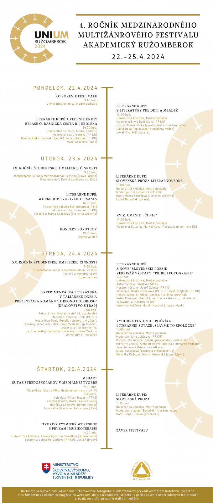 Medzinárodný multižánrový festival Akademický Ružomberok UNIUM 2024 sa otvára pre širokú verejnosť 4. krát, ako súčasť budovania identity akademickej tradície. UNIUM v názve odkazuje na univerzitu ako srdce podujatia, ale aj na umenie a ľudský um, a tiež univerzum, ktoré nás spája a dáva možnosť ho spoločne vytvárať. Postupnými krokmi chceme z neho urobiť podujatie, ktoré bude fórom hodnotovej a intelektuálnej formácie mladých ľudí, pri ktorej radi privítame aj širšiu verejnosť. Diskusie, workshopy, literárne čítačky, hudobné koncerty, súťaž v mediálne tvorbe tvoria už jeho stabilnú kostru.
