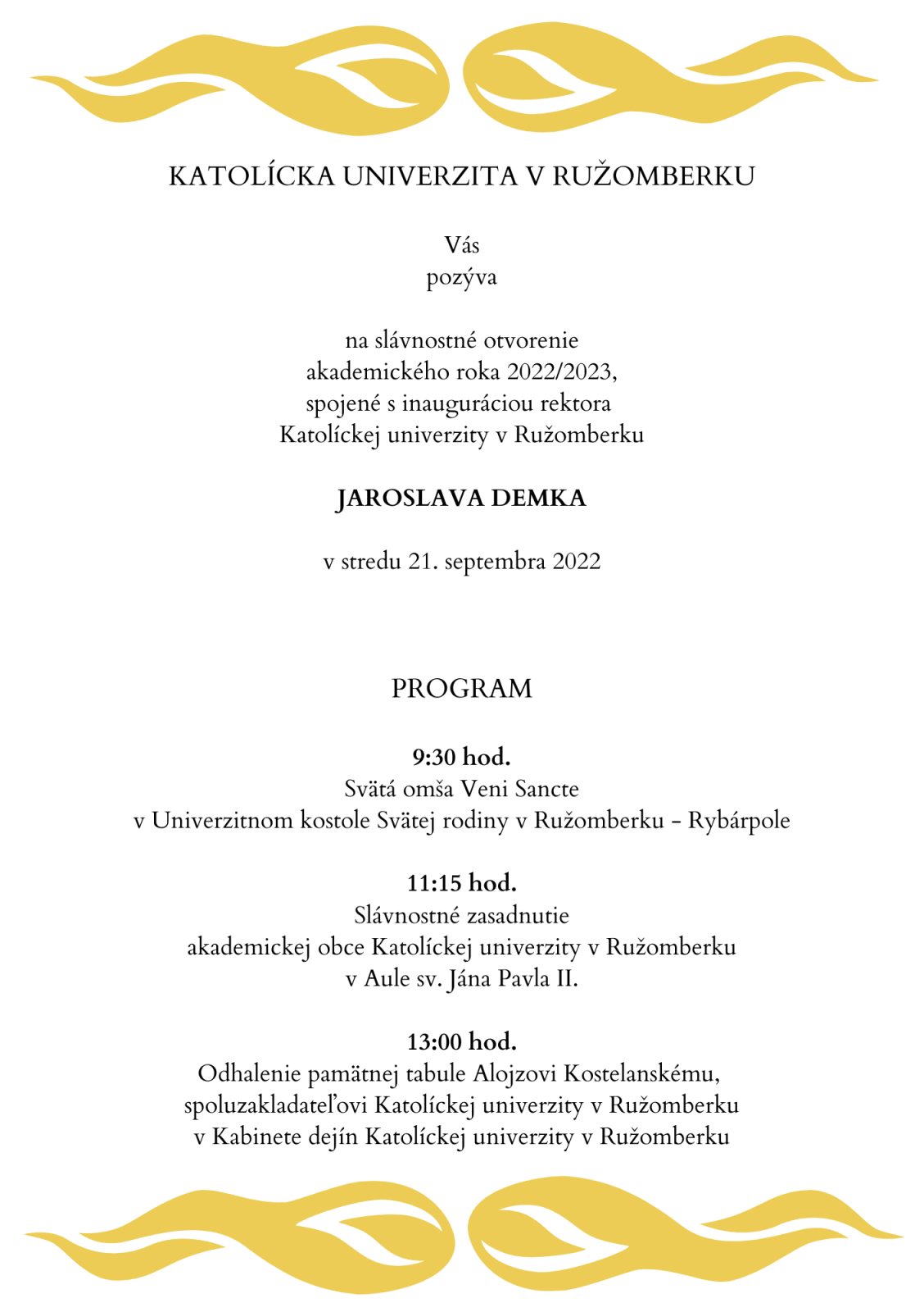 Katolícka univerzita v Ružomberku Vás pozýva na slávnostné otvorenie akademického roka 2022/2023, spojené s inauguráciou rektora Katolíckej univerzity v Ružomberku Jaroslava Demka.