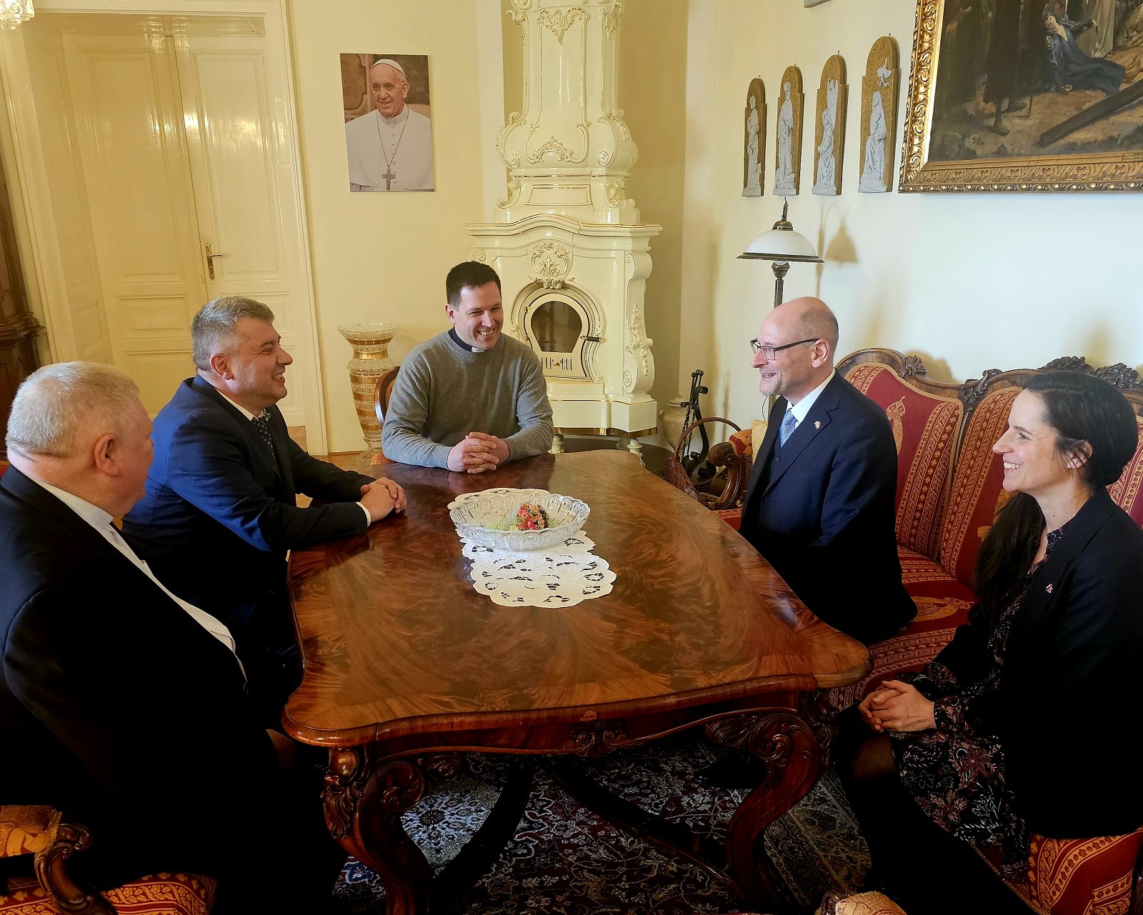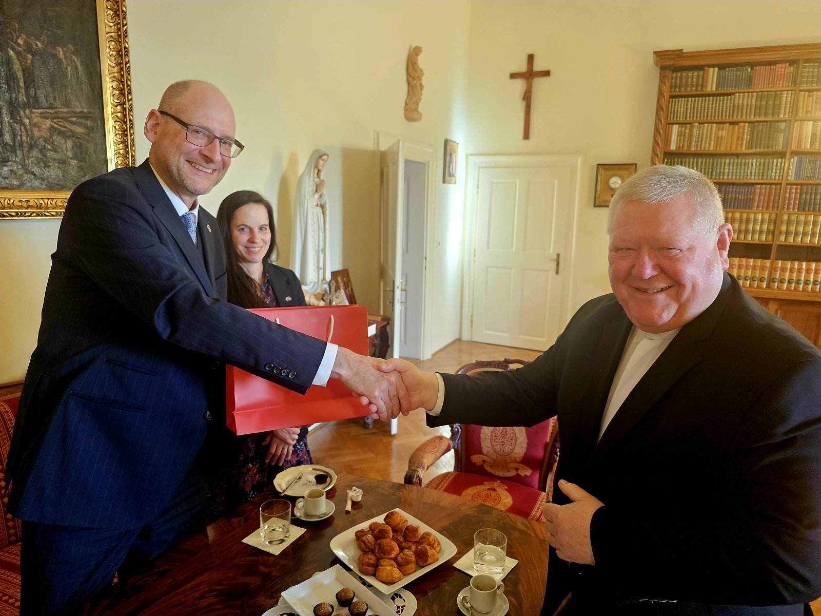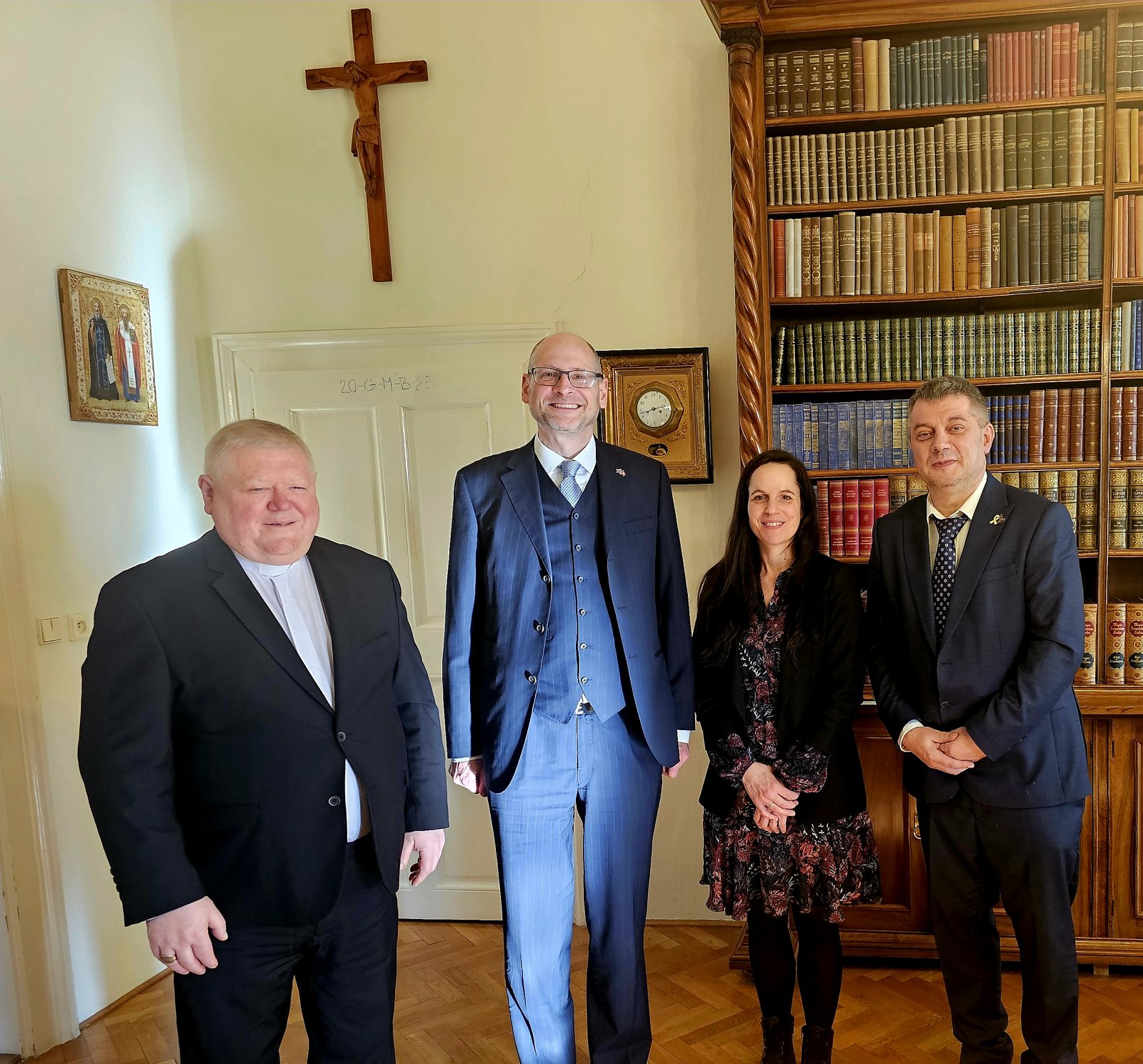 Dňa 19. februára 2025 navštívil Nitru veľvyslanec Švajčiarskej konfederácie J. E. Peter Nelson (obr. 1). Súčasťou jeho programu bola aj návšteva biskupského úradu, kde ho privítal nitriansky biskup J. E. prof. Viliam Judák (obr. 2). Spoločne diskutovali najmä o náboženskej a kultúrnej situácii na Slovensku a vo Švajčiarsku ako aj o širších spoločenských témach. Pán biskup oboznámil vzácneho hosťa s bohatými dejinami nitrianskeho biskupstva a podelil sa so svojimi skúsenosťami z návštev Švajčiarska v minulosti. Pán veľvyslanec podobne informoval o zaujímavostiach zo švajčiarskeho prostredia nielen akademického a kultúrneho ale tiež duchovného. Stretnutie prebiehalo vo veľmi priateľskej atmosfére, čoho dôkazom je i skutočnosť, že sa časovo takmer trojnásobne predĺžilo. (obr. 3)