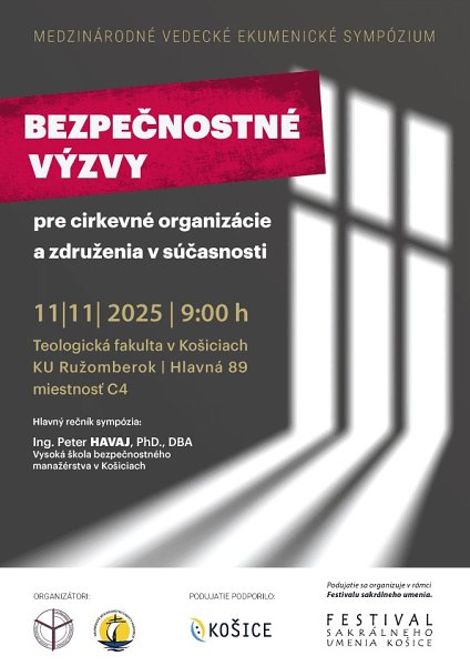 Ekumenické spoločenstvo cirkví a náboženských spoločností na území mesta Košice a Teologická fakulta Katolíckej univerzity v Ružomberku Vás pozývajú na medzinárodné vedecké ekumenické sympózium pod názvom Bezpečnostné výzvy pre cirkevné organizácie a združenia v súčasnosti. Miesto konania: Teologická fakulta v Košiciach Katolíckej univerzity v Ružomberku, Hlavná 89, Košice, 11.11.2025 o 9.00h, miestnosť C4.
