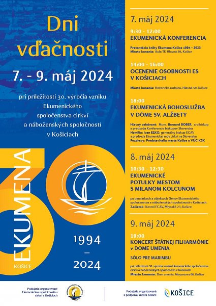 Ekumenické spoločenstvo cirkvi a náboženských spoločností v Košiciach pripravuje Dni vďačnosti. Uskutočnia sa v dňoch 7. – 9. mája 2024 pri príležitosti 30. výročia vzniku Ekumenického spoločenstva cirkví a náboženských spoločnosti v Košiciach.