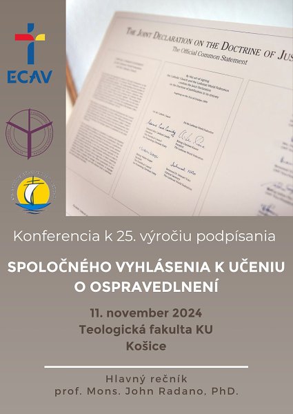 Ekumenický výbor Evanjelickej cirkvi a.v. na Slovensku (ECAV) spolu s predstaviteľmi Katolíckej univerzity a jej Teologickej fakulty v Košiciach a s Ekumenickým spoločenstvom v Košiciach pripravuje dňa 11.11. 2024 o 12.30h v aule TF KU medzinárodnú Konferenciu k 25.výročiu podpísania Spoločného vyhlásenia k učeniu o ospravedlnení.