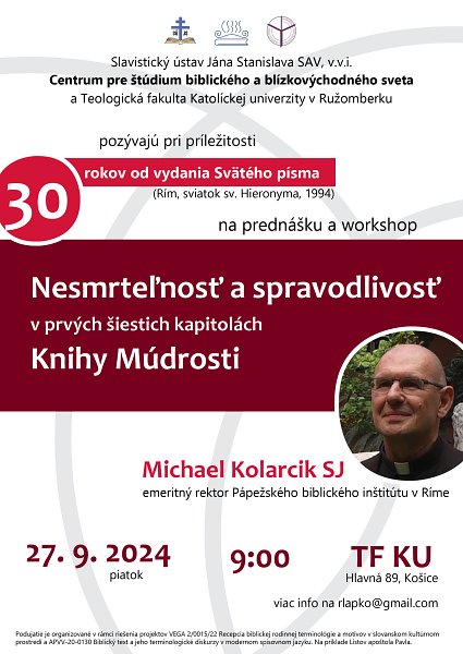 Slavistický ústav Jána Stanislava SAV, v.v.i., Centrum pre štúdium biblického a blízkovýchodného sveta a Teologická fakulta Katolíckej univerzity v Ružomberku pozývajú pri príležitosti 30 rokov od vydania Svätého písma (Rím, sviatok sv. Hieronyma, 1994) na prednášku a workshop: "Nesmrteľnosť a spravodlivosť v prvých šiestich kapitolách Knihy Múdrosti." Prednáša Michael Kolarcik SJ, emeritný rektor Pápežského biblického inštitútu v Ríme. Prednáška sa uskutoční 27.9.2024 o 9:00, na TF KU, Hlavná 89, Košice.