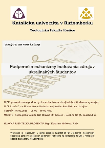 Pozývame vás na workshop „Podporné mechanizmy budovania zdrojov ukrajinských študentov“, ktorý je realizovaný v rámci projektu IG-2024-01-PD, riešeného na Teologickej fakulte v Košiciach, Katolíckej univerzity v Ružomberku. Workshop sa uskutoční 16.9.2025 v posluchárni C4, na TF KU.