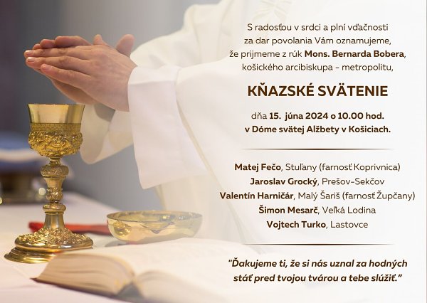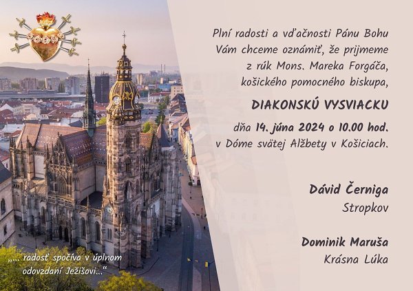 diakonská vysviacka bude v piatok, 14.6.2024 o 10.00 hod., kňazská vysviacka v sobotu, 15.6.2024 o 10.00 hod. v Dóme sv. Alžbety