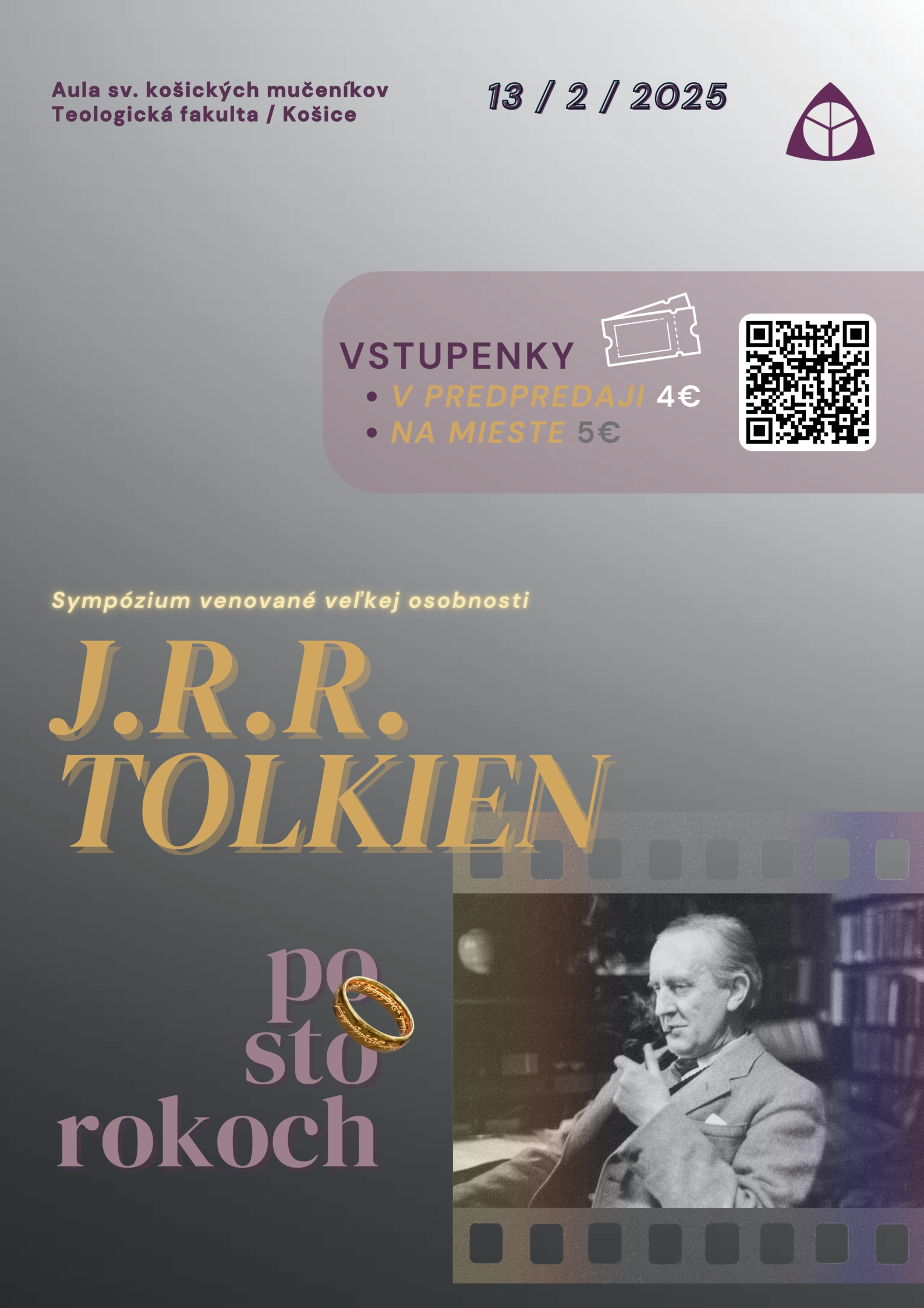 Dňa 13.2.2025 od 16.00 do 20.00 vás pozývame na priateľské sympózium o osobnosti a diele J. R. R. Tolkiena s hosťom z Univerzity Karlovej v Prahe, prof. Pavlom Hošekom, https://web.etf.cuni.cz/ETFN-680.html.