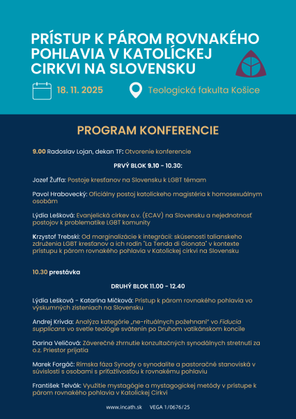 Teologická fakulta KU pripravuje vedeckú konferenciu "Prístup k párom rovnakého pohlavia v Katolíckej cirkvi na Slovensku“ 18.11.2025 od 9.00 do 13.00 hod.