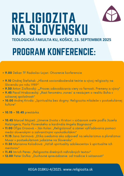 Konferencia „Religiozita na Slovensku“, ktorá sa konala 23.9.2025 na Teologickej fakulte KU, ponúkla široké odborné poznatky o súčasnej situácii náboženstiev a religiozity z rôznych uhlov pohľadu: filozofia, teológia, sociológia, psychológia, spiritualita a iné. Konferencia je súčasťou riešenia projektu KEGA 018KU-4/2025.