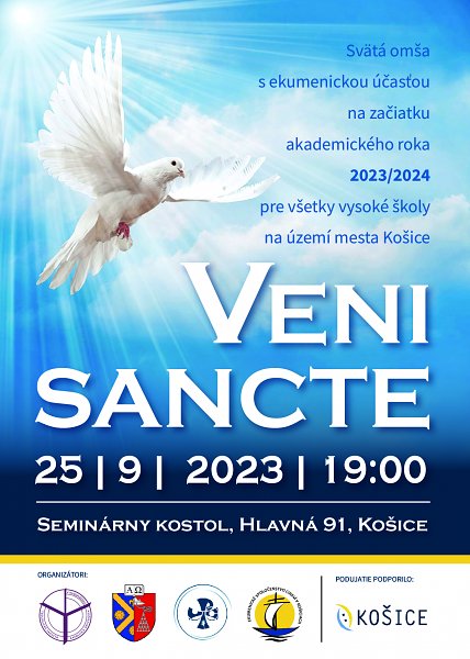 Teologická fakulta KU v Ružomberku, Kňazský seminár sv. Karola Boromejského v Košiciach a Univerzitné pastoračné centrum sv. Košických mučeníkov v Košiciach v spolupráci s Ekumenickým spoločenstvom cirkví a náboženských spoločností na území mesta Košice Vás srdečne pozývajú dňa 25. 9. 2023, 19:00 na slávnostné Veni Sancte.