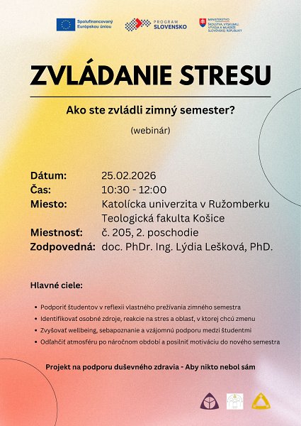 Dňa 25.02.20256 sa v čase od 10,30 hod. – 12,00 hod. uskutoční webinár na tému: „Zvládanie stresu. Ako ste zvládli zimný semester?“ V rámci prebiehajúceho projektu Katolíckej univerzity v Ružomberku „Projekt na podporu duševného zdravia – Aby nikto nebol sám“. Miesto konania je Teologická fakulta Košice, miestnosť č. 205 (2. poschodie). Webinár bude viesť doc. PhDr. Ing. Lýdia Lešková, PhD.