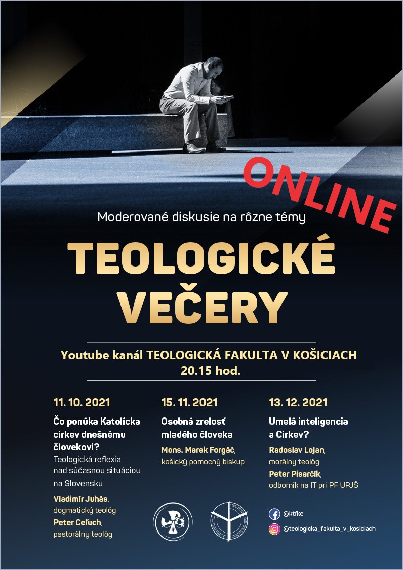 Vzhľadom na pandemickú situáciu budú Teologické večery prebiehať v ONLINE forme. Bude možné sledovať ich záznam prostredníctvom Youtube kanála Teologickej fakulty s oficiálnym názvom „Teologická fakulta v Košiciach“ (klikni sem: https://www.youtube.com/playlist?list=PL08wJdJAL8Y1zNRhxD7b0SzMWqtcFTTWm ).