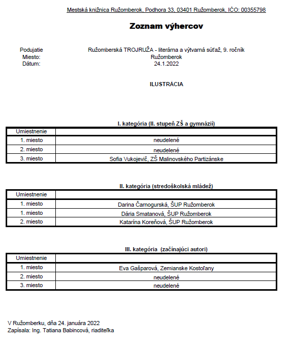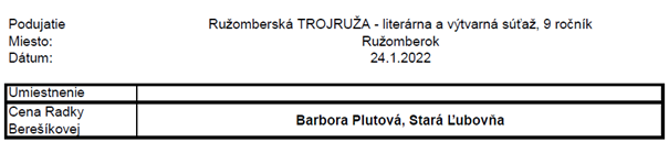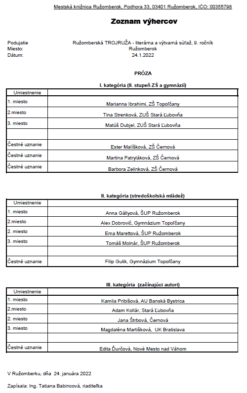 Program pokračoval módnou prehliadkou Školy umeleckého priemyslu z Ružomberka. Vzácnou súčasťou podujatia bolo vyhlásenie výsledkov 9. ročníka literárnej súťaže Ružomberská trojruža. Vyhlásením umiestnení v jednotlivých kategóriách sprevádzala podujatie riaditeľka Mestskej knižnice v Ružomberku Ing. Tatiana Babincová, pričom na hodnotenie úrovne prác v predmetnom ročníku si prizvala spisovateľov PhDr. Petra Mišáka a Ing. Milana Igora Chovana.