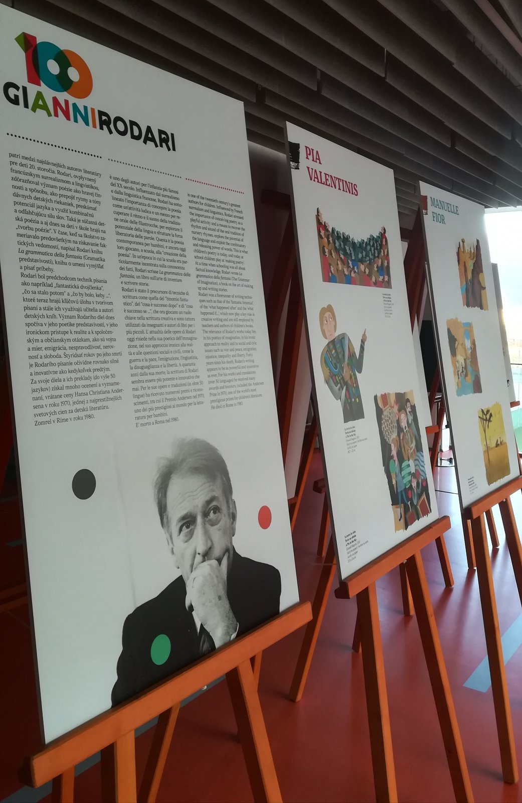 Výstava je rozšírená o slovenský kontext - slovenské vydania Rodariho rozprávok a animovaný film Hviezdny taxík Juraja Krumpolca a Igora Derevenca. Súčasťou výstavy budú aj preklady Rodariho rozprávok do slovenčiny, s ktorými sa popasovali študenti talianskej bilingválnej sekcie Gymnázia na ul. L. Sáru v Bratislave.