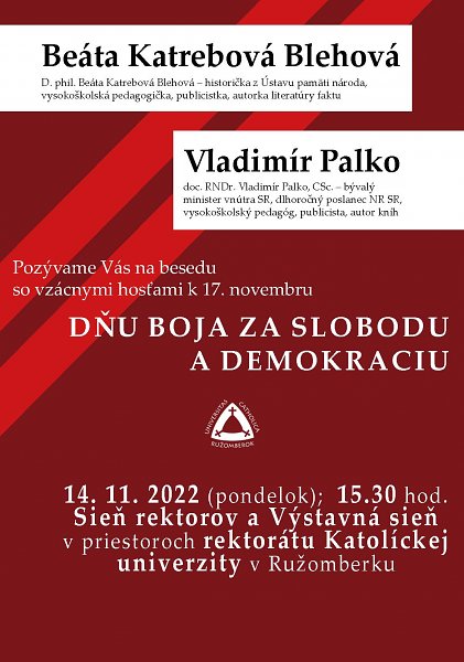 Pozývame Vás na besedu so vzácnymi hosťami k 17. novembru DŇU BOJA ZA SLOBODU A DEMOKRACIU. Diskutovať budú Beáta Katrebová Blehová a Vladimír Palko v Sieni rektorov a vo Výstavnej sieni v priestoroch rektorátu Katolíckej univerzity v Ružomberku.
