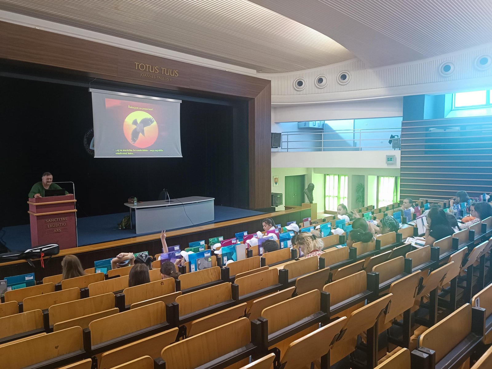 Pondelok bol výnimočný tým, že sa program odohrával mimo priestorov Katolíckej univerzity. Vycibrili sme si svoje mozgy a všetky zmysly v Slovenskom múzeu ochrany prírody a jaskyniarstva, kde sme si prešli stálu expozíciu múzea, ale prakticky sme vyskúšali svoje poznatky na pripravených stanovištiach o živote včiel, o objavovaní skamenelín alebo o rozpoznávaní vtáčieho spevu.