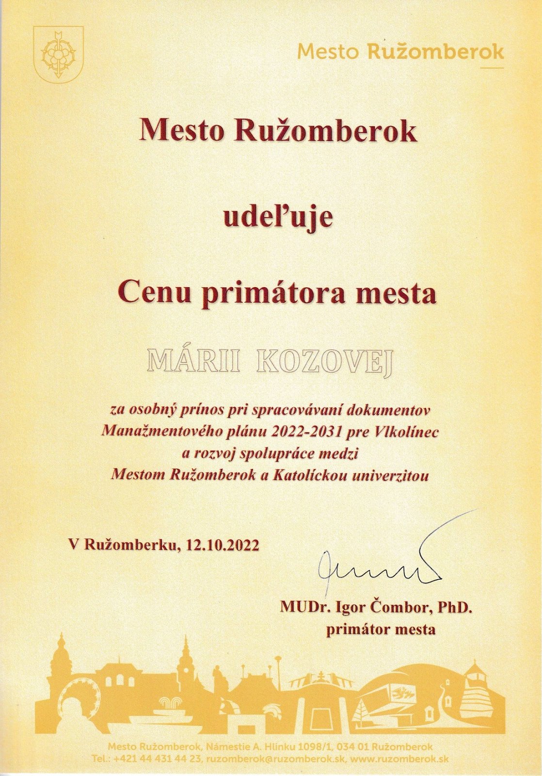 V úvodnej časti stretnutia viceprimátor mesta Ružomberok pán Michal Lazár odovzdal Cenu primátora mesta Ružomberok prof. RNDr. Márii Kozovej, CSc. za jej osobný prínos pri spracovávaní dokumentov Manažmentového plánu 2022 - 2031 pre Vlkolínec a za rozvoj spolupráce medzi mestom Ružomberok a Katolíckou univerzitou v Ružomberku. Ako zhodnotila prof. Kozová, ocenenie nepatrí len jej, ale všetkým tým pracovníkom KU v Ružomberku, ktorí sa spolu s ňou podieľali na spolupráci s Mestom Ružomberok v priebehu rokov 2014 - 2022. Ocenenie je zároveň pre KU v Ružomberku záväzkom, aby spolupráca s mestom Ružomberok naďalej úspešne pokračovala, aj v podobe príprav 30. výročia zápisu Vlkolínca do Zoznamu svetového kultúrneho a prírodného dedičstva.