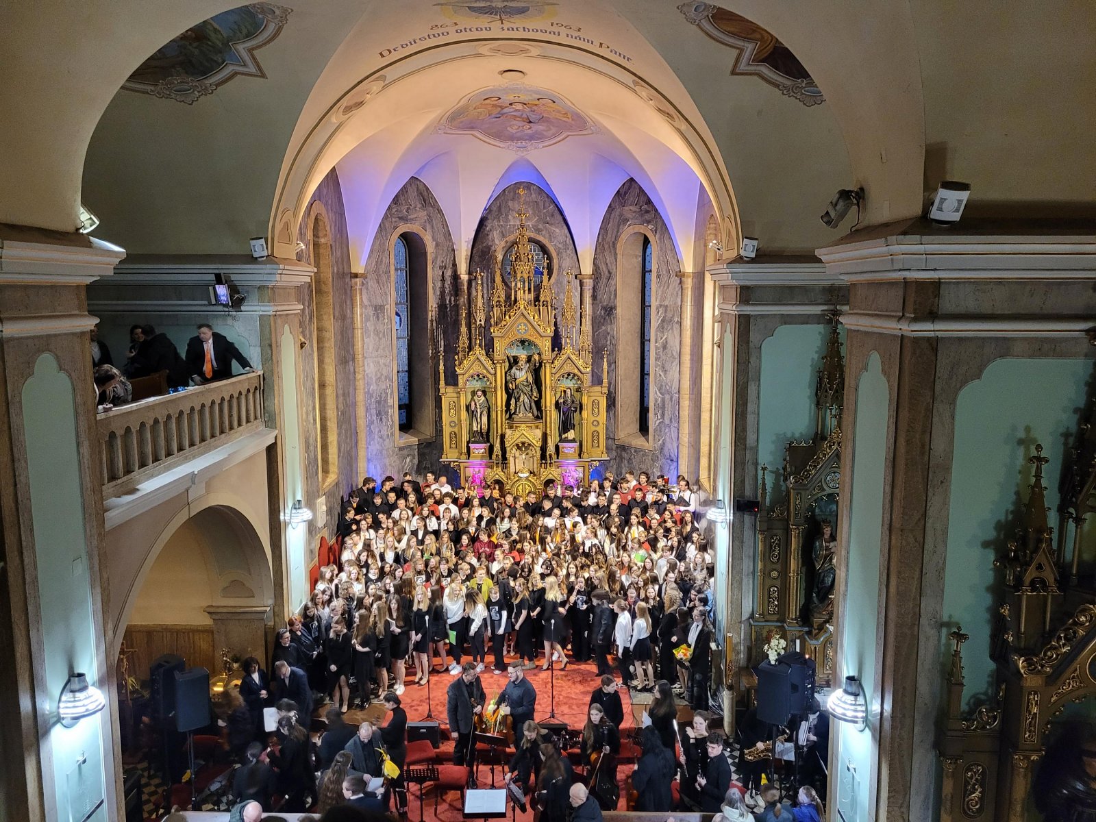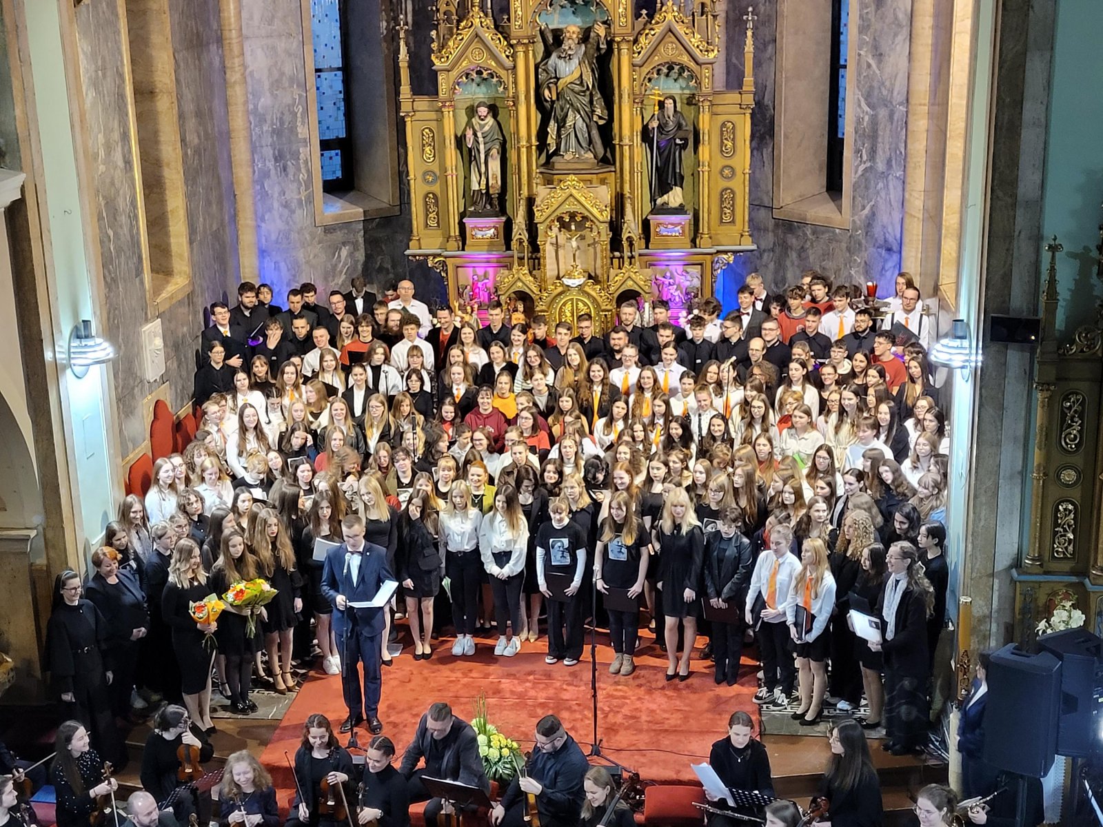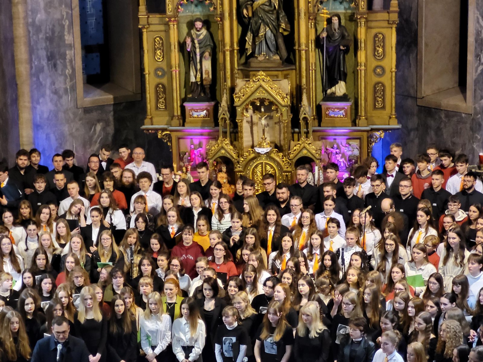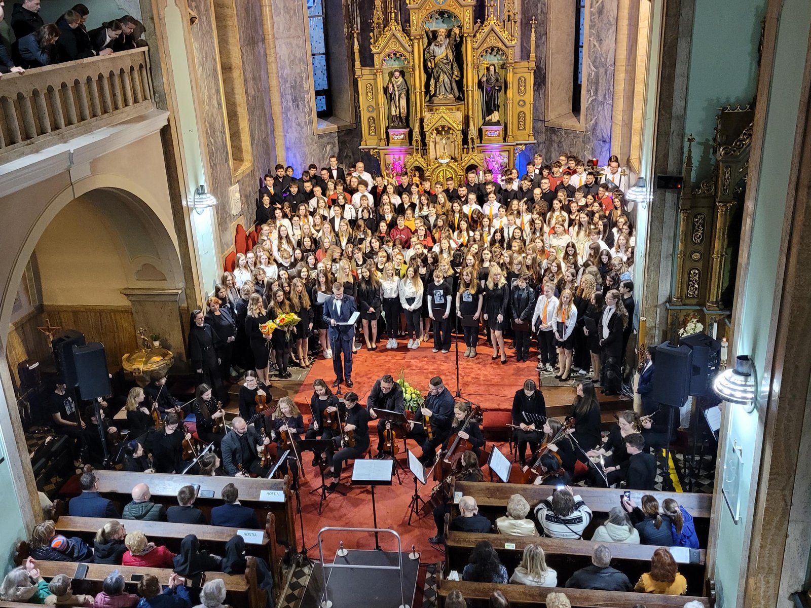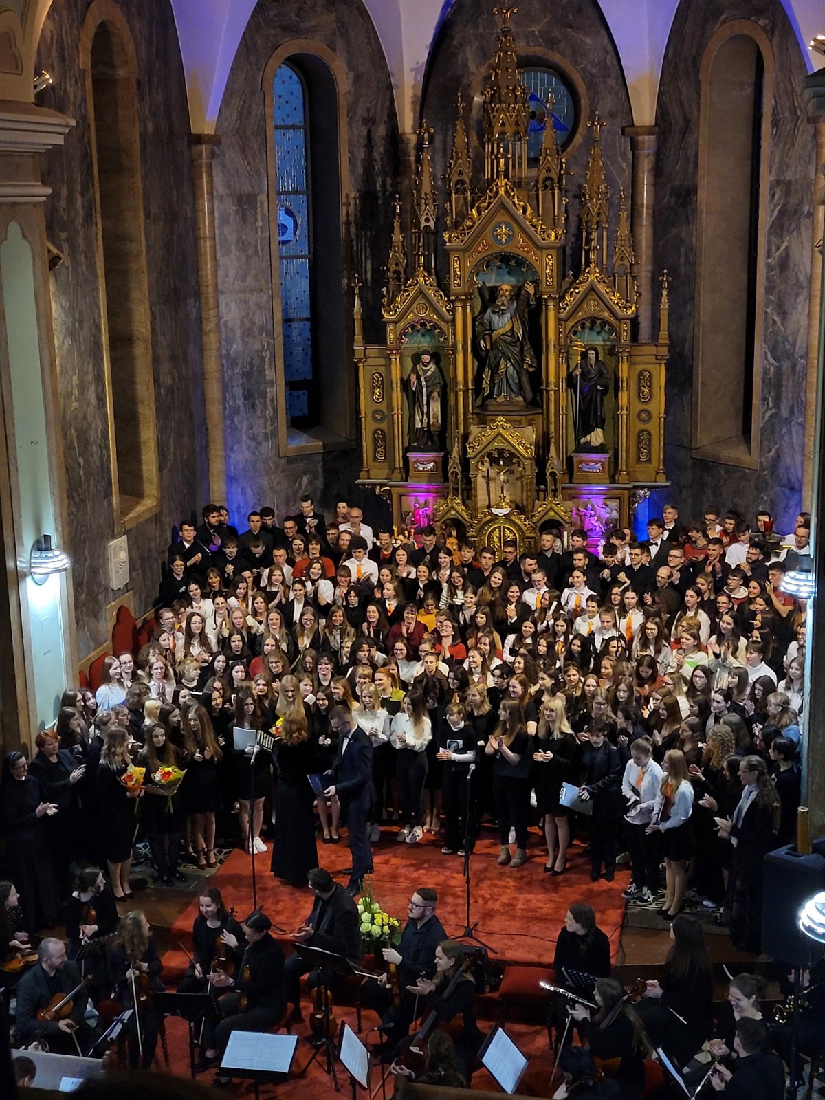Vyvrcholením festivalu Cantare Choraliter bol slávnostný záverečný koncert, ktorý sa konal v piatok 21. apríla o 18. hodine vo Farskom kostole sv. Ondreja. Hostí večerom sprevádzali pedagógovia Gymnázia sv. Andreja, riaditeľ gymnázia Kamil Nemčík a Martina Galanová. Mladí speváci poslucháčom v dvoch hodinách odovzdali to najlepšie zo seba. V priestoroch chrámu znel oduševnený spev spevákov plných nadšenia a entuziazmu. Repertoár bol veľmi pestrý. Večerom zaznela hudba rôznych štýlových období a žánrov, počnúc tvorbou barokového velikána Johanna Sebastiana Bacha, končiac v tvorbe súčasných autorov gospelovej a populárnej hudby. I v tom tkvie jedinečnosť tohto festivalu. Atmosféra bola skutočne úžasná. V tvárach poslucháčov sa zrkadlil obdiv a pokoj. A ako sa hovorieva – to najlepšie na koniec, tak sa aj stalo. Všetci spojili svoje sily. V tomto momente patrí osobitá česť vzrastom útlej, no umelecky zdatnej dirigentke Zuzane Zahradníkovej, pod ktorej taktovkou odzneli okrem vznešenej interpretácie univerzitného zboru Benedictus i skladby spoločného repertoáru všetkých zúčastnených zborov. Na záver koncertu sa tak pod jej rukami ocitlo takmer 300 spevákov a inštrumentalistov. Neopakovateľný zážitok z interpretácie spoločných skladieb bol umocnený sprievodom komorného orchestra, ktorý odborne viedol profesor Rastislav Adamko. Na nástrojoch hrali pedagógovia a poslucháči Katedry hudby, no veľkým prínosom boli i učitelia a žiaci ZUŠ Ľudovíta Fullu a ďalší hostia. Tu máme ukážkový príklad toho, že na vytvorenie niečoho úžasného netreba viac ako spojiť sily. Pre účinkujúcich bol odmenou neutíchajúci potlesk a „standing ovation“ preplneného kostola. Podporu umelcom prišli prejaviť mladí i starí. Veríme, že každý si našiel niečo pre seba. Pre tých, ktorí koncert nestihli, alebo by sa chceli vrátiť späť do koncertného večera a skladby si opäť vypočuť, pripravuje Gymnázium sv. Andreja videozáznamy, ktoré budú sprístupnené na školskom Youtube kanáli.