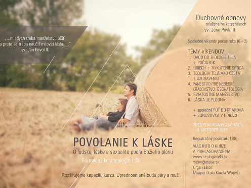 Vás pozývajú na Formačný kurz teológie tela “Povolanie k láske”. Kurz bude prebiehať počas šiestich víkendov od októbra 2021 do júna 2022 (ak to pandemická situácia dovolí) striedavo na západe (pri Trenčíne) alebo na východe Slovenska (pri Spišskej Novej Vsi). Je vedený formou duchovných obnov, ktoré sú zamerané na formáciu podľa katechéz sv. Jána Pavla II. teológie tela. Prihlasovanie potrvá do 10. septembra 2021.