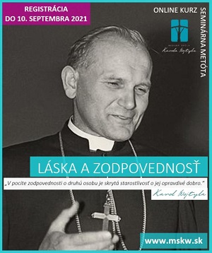 Misijná škola Karola Wojtylu v spolupráci s Teologickou Fakultou KU v Košiciach ponúka Semestrálny akademicko-formačný program o knihe Karola Wojtylu: Láska a zodpovednosť. Bude prebiehať od septembra 2021 do januára 2022 online formou počas 13 týždňov. Seminárna metóda, ktorú používame, ti umožní študovať originálny text knihy Láska a zodpovednosť, a diskutovať o ňom v malej skupine pod odborným vedením skúsených lektorov. Chceme s vami budovať spoločenstvo prostredníctvom štúdia, diskusie, zdieľania a spoločnej modlitby. Naším cieľom je pomôcť jeden druhému pochopiť odkaz Karola Wojtylu – nádej o Božom pláne pre ľudskú lásku a sexualitu. Účastníci kurzu budú študovať priamo dielo Karola Wojtyłu Láska a Zodpovednosť. Viac informácií o programe Láska a zodpovednosť nájdete na https://mskw.sk/sk/laska-a-zodpovednost/.
