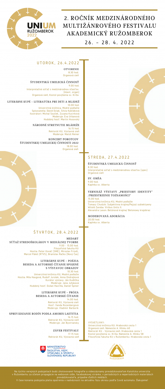 Výtvarníci predstavia tvorbu pri vernisáži medzinárodnej výstavy Priestory identity, ktorú bude hostiť Univerzitná knižnica KU. Žurnalisti sa do programu 2. ročníka UNIUM 2022 zapoja populárnou celoslovenskou súťažou v mediálnej tvorbe stredoškolákov, zastrešenou profesionálnymi porotcami z celoslovenských médií, s názvom MEDart.